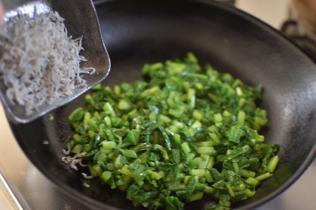 刻んだ葉をたっぷりのごま油と炒めます。しんなりしてきたら、[塩・ごま・しらす]を加えて味を調えたらできあがり。5分もあれば完成です。