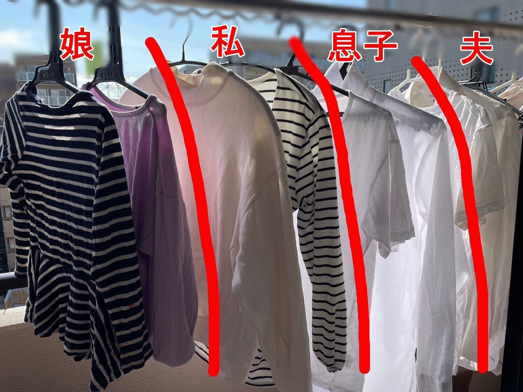 後のラクさを考えて、洗濯物を干す時にもひと工夫。ハンガーに掛けた洗濯物は、服の持ち主ごとに分けて干します。