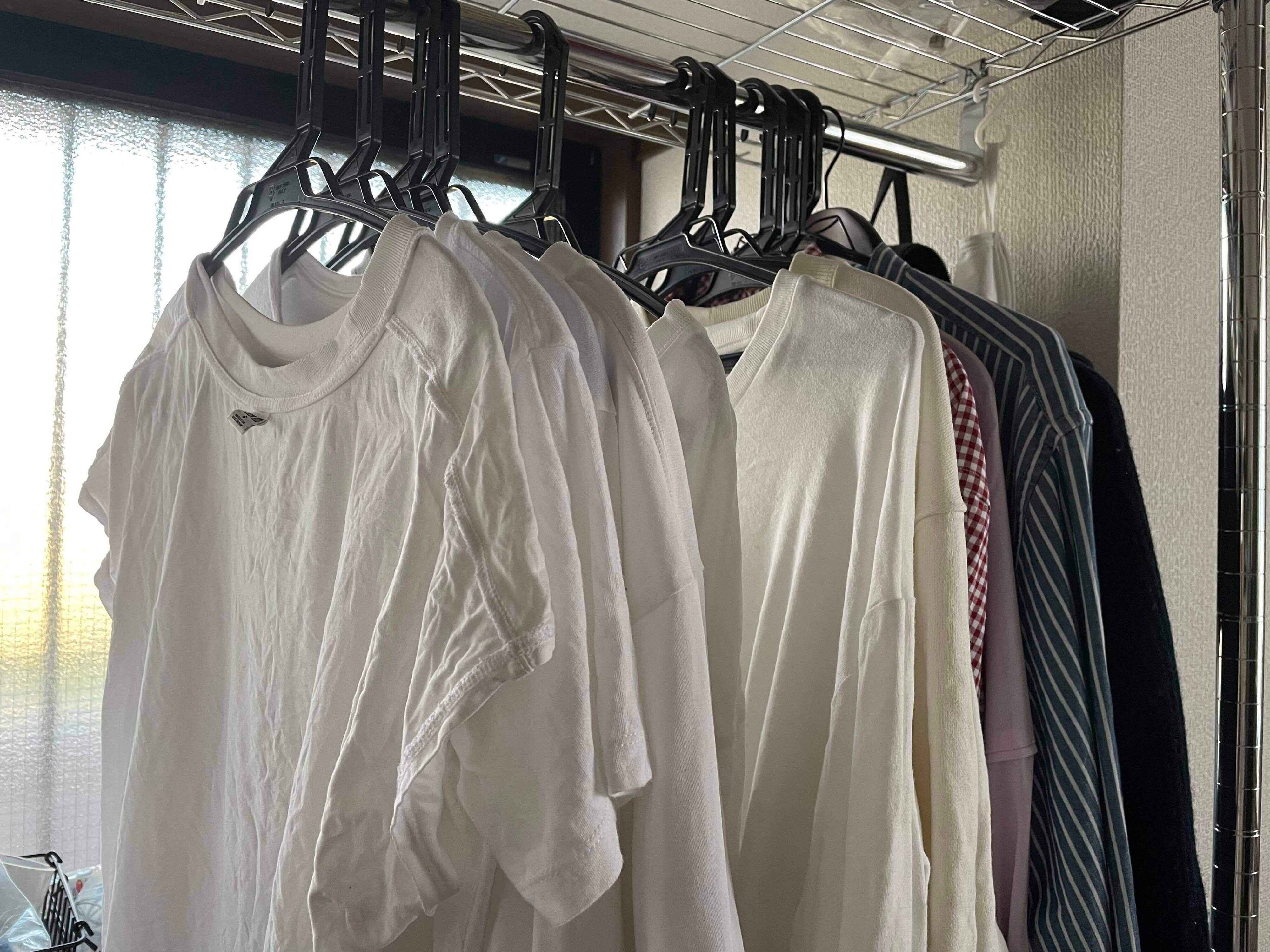 洗濯用と収納用とハンガーを一緒にして、乾いた服はそのままクローゼットに直行。クローゼットの近くに物干しをおくようにすれば、動線が短くなって片付けがもっと楽になります。