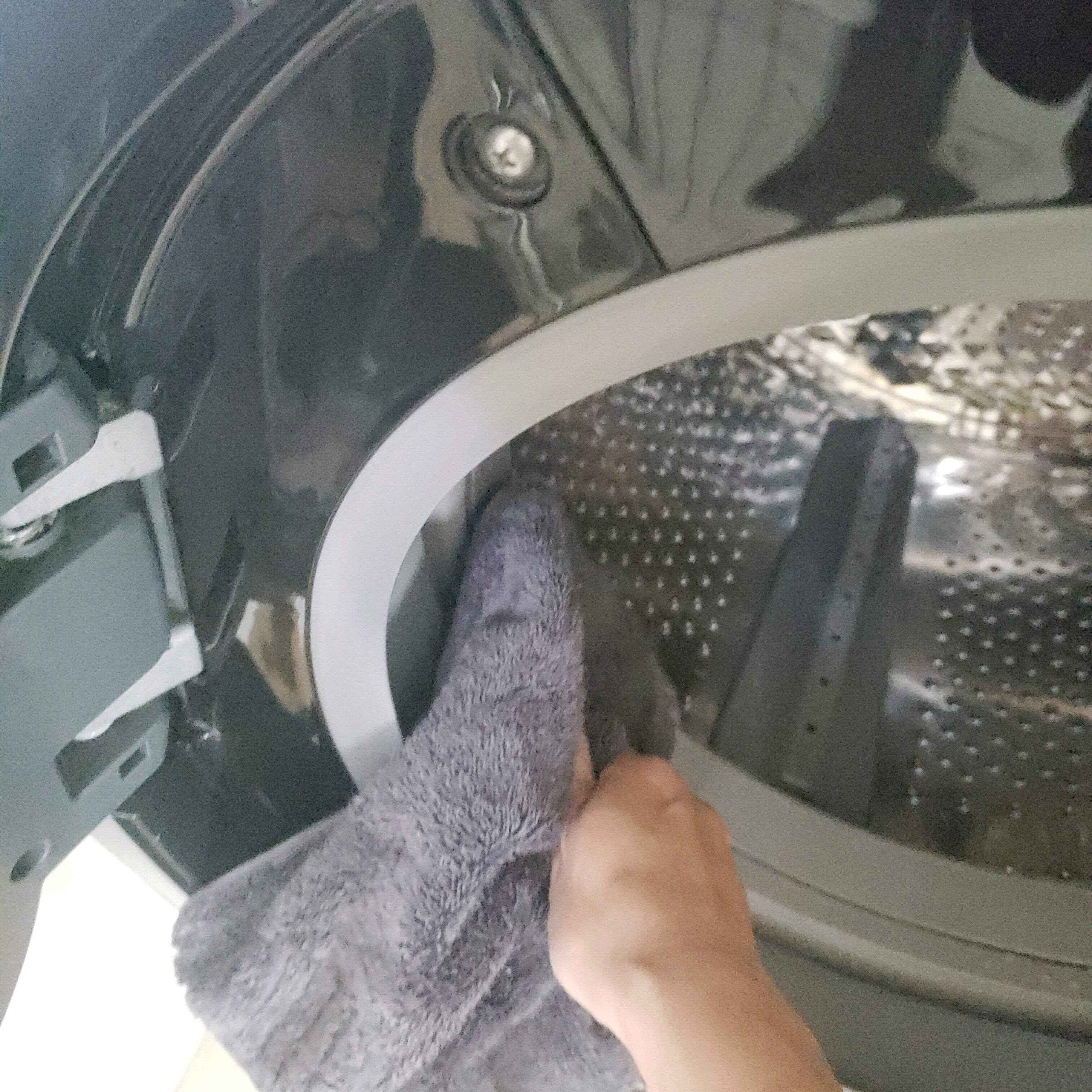 ドアパッキンも拭き取ります。ドアパッキンの内側は糸くずなど溜まりやすいので、指を突っ込んでぐるっと一周拭きます。