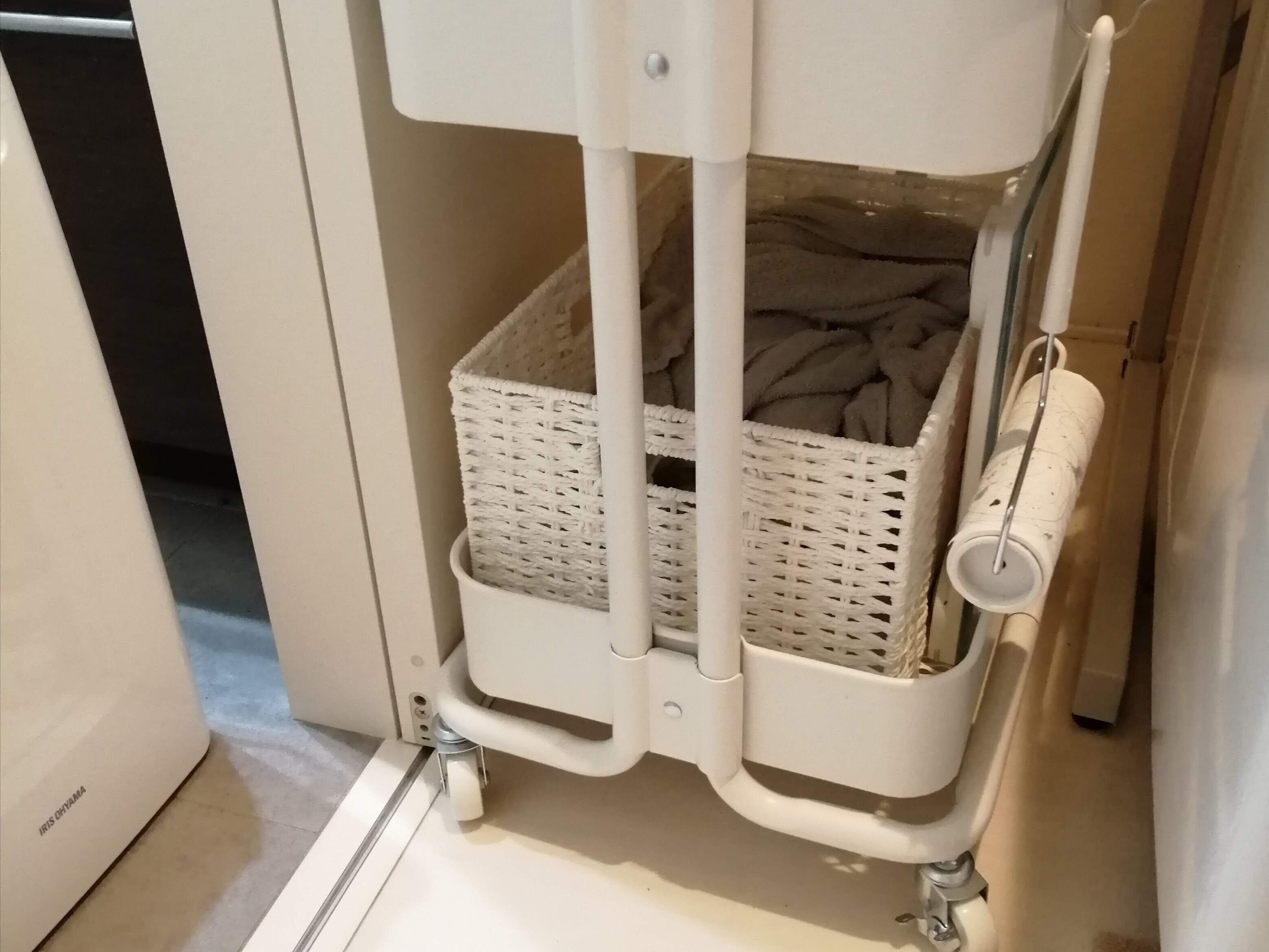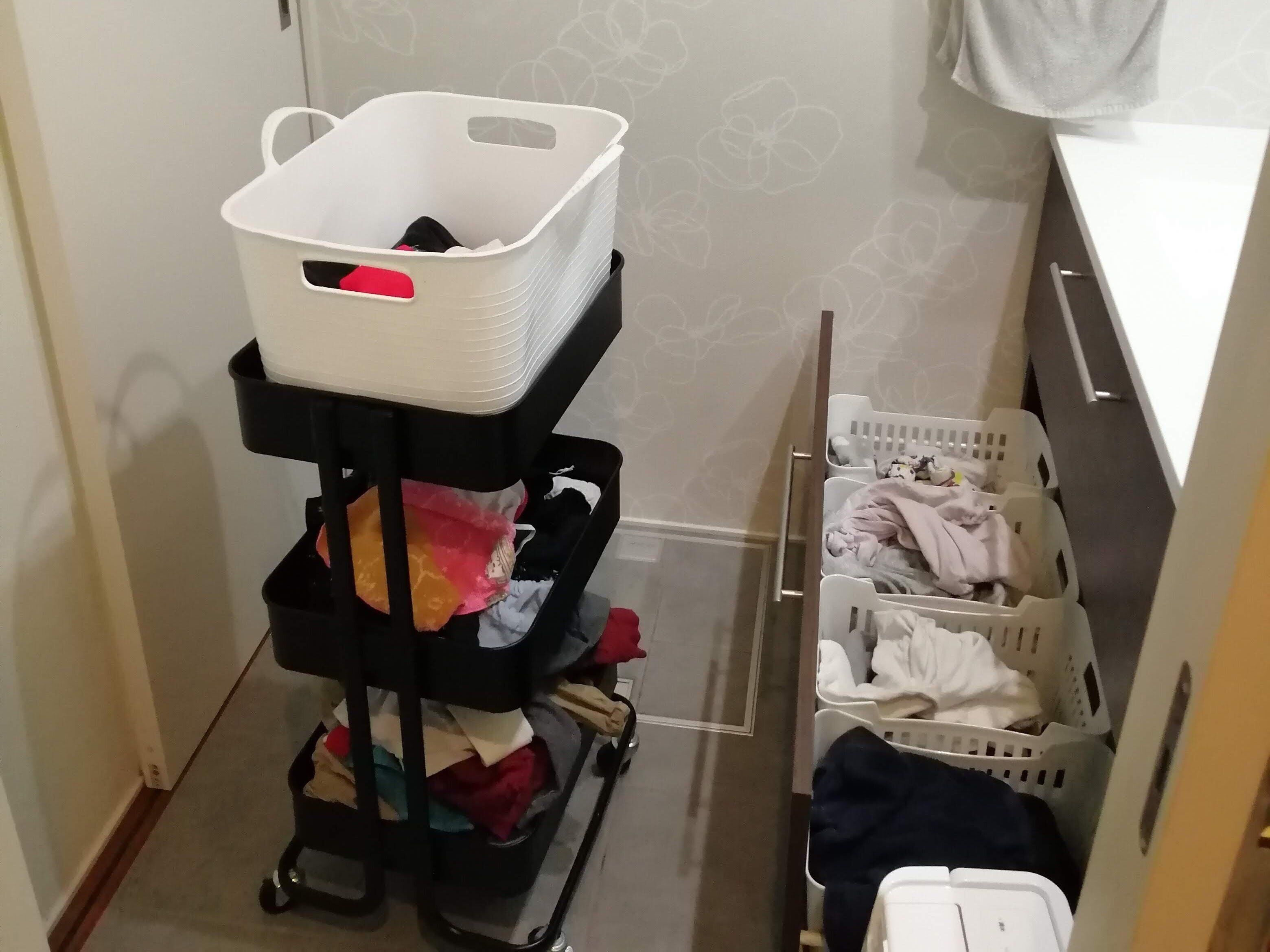 乾いた人別の洗濯物は、個人別に3段カートに投げ込みます。そこからは各自の仕事です。