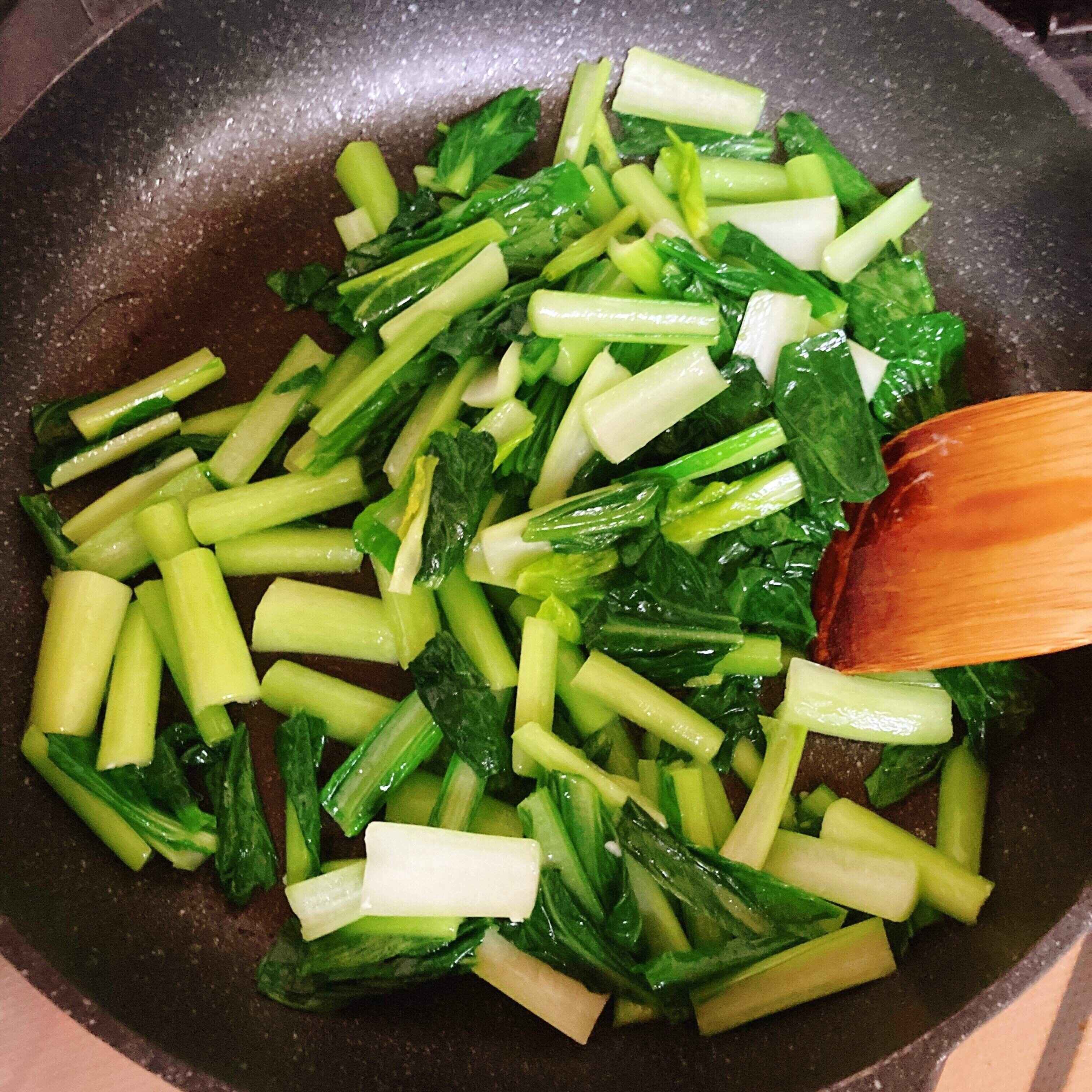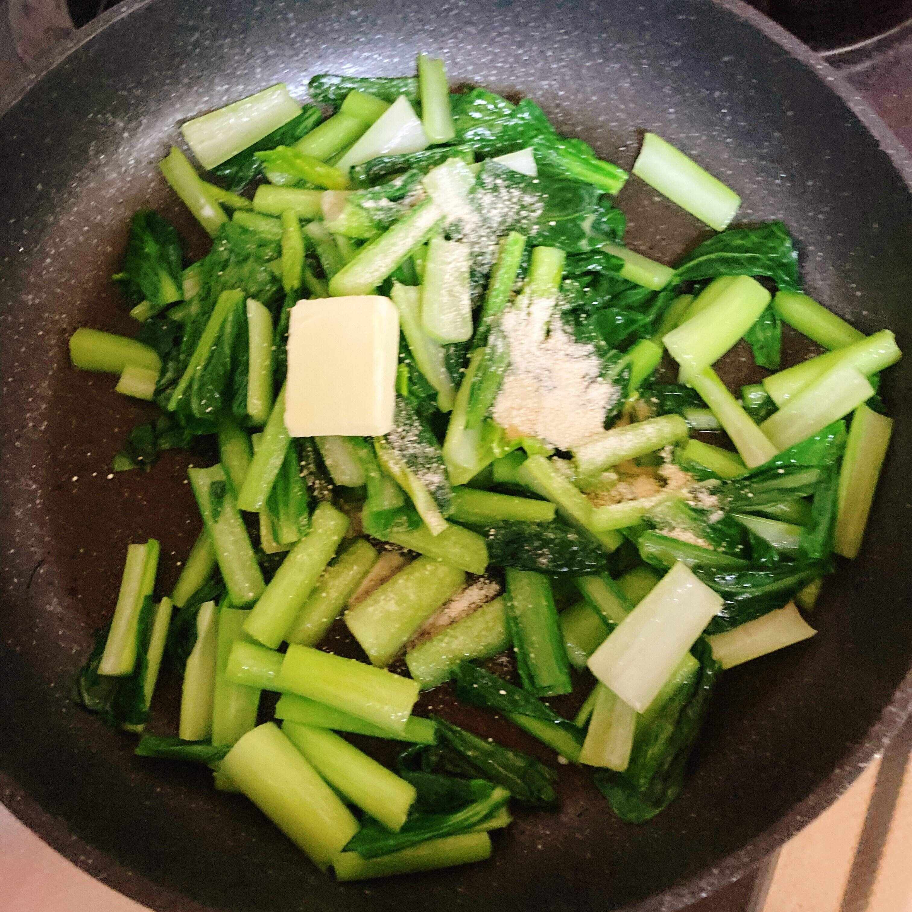 小松菜がしんなりしてきたら、鶏がらスープの素・バター・コショウを入れてからめる。