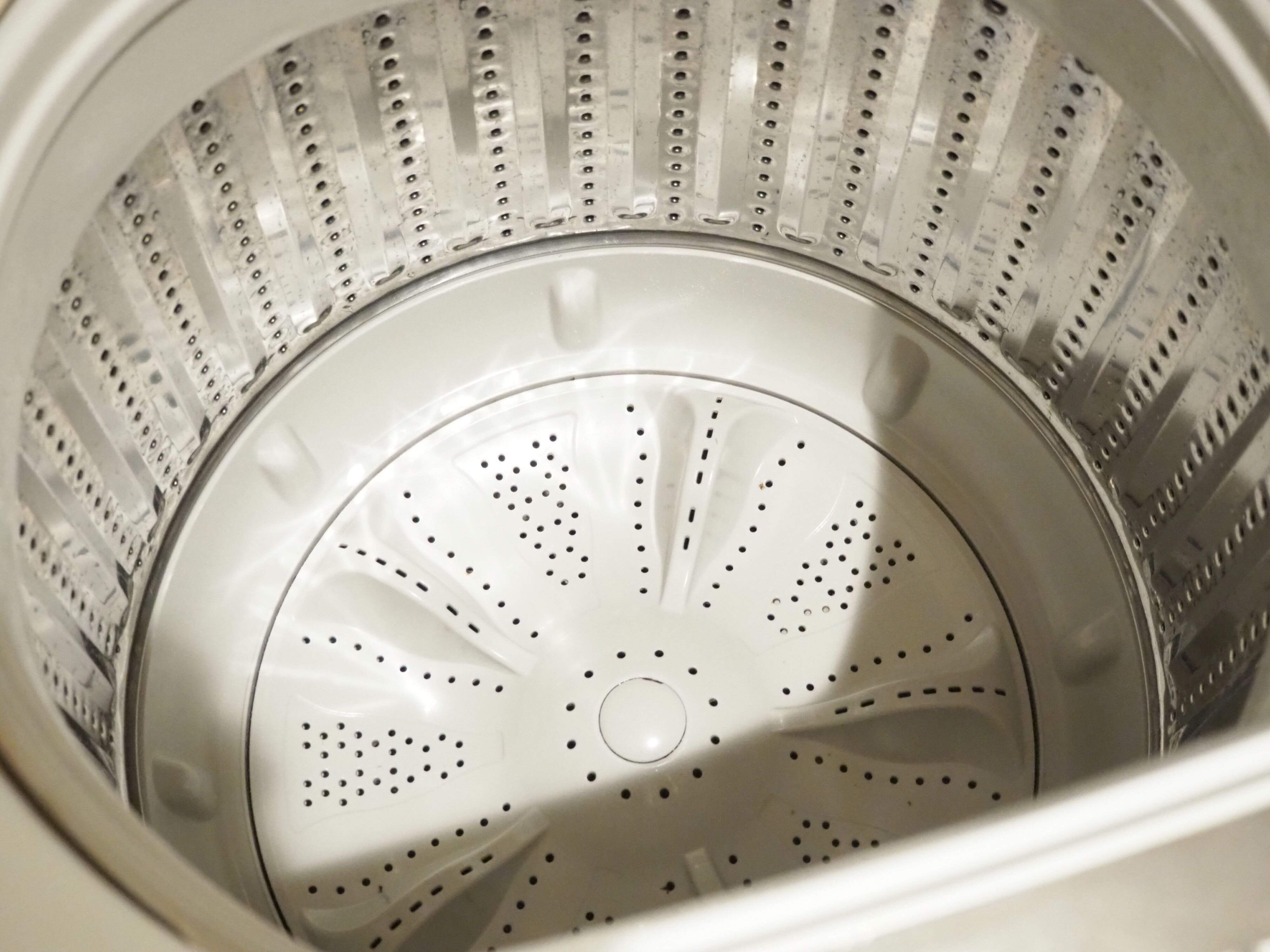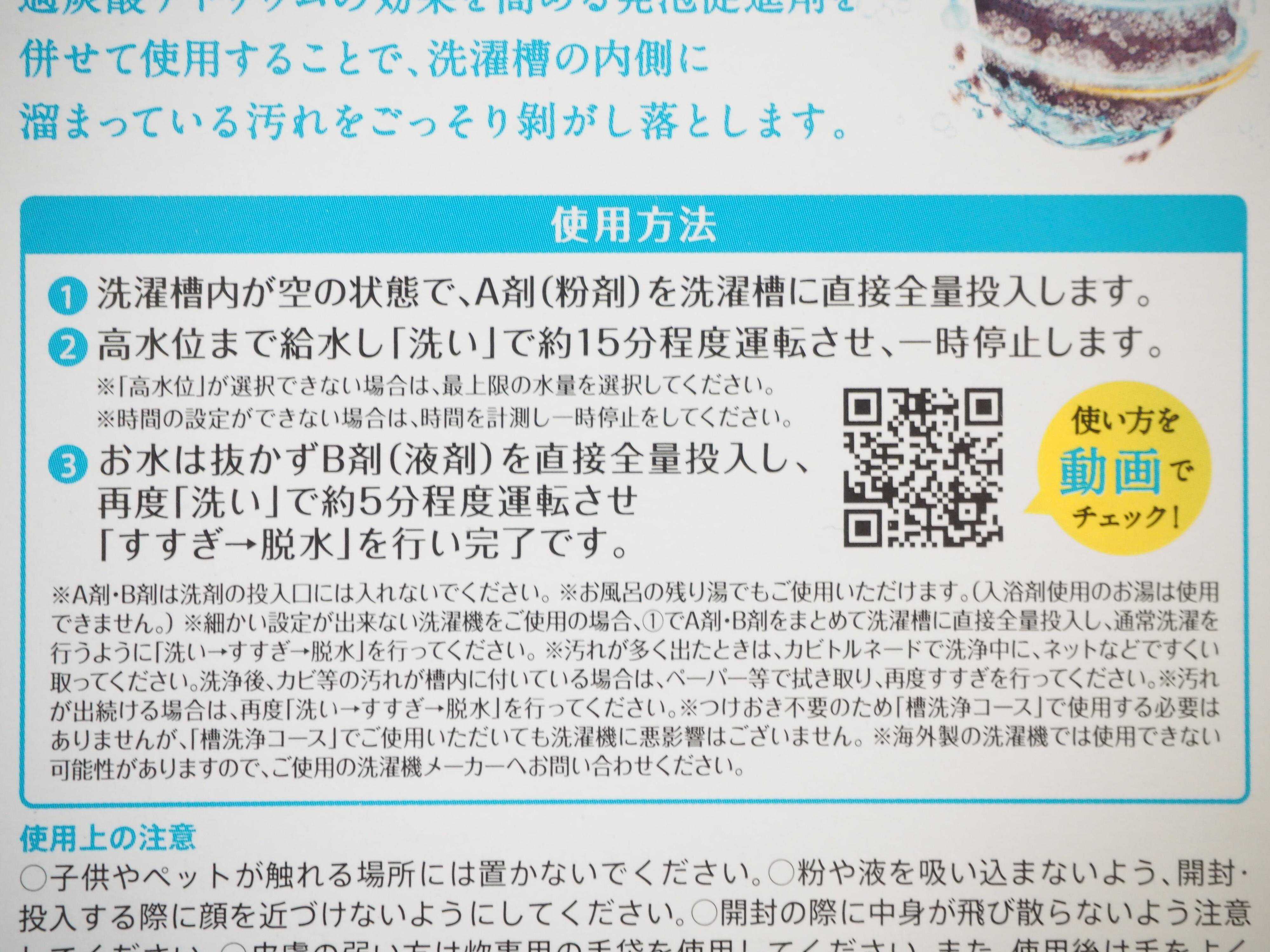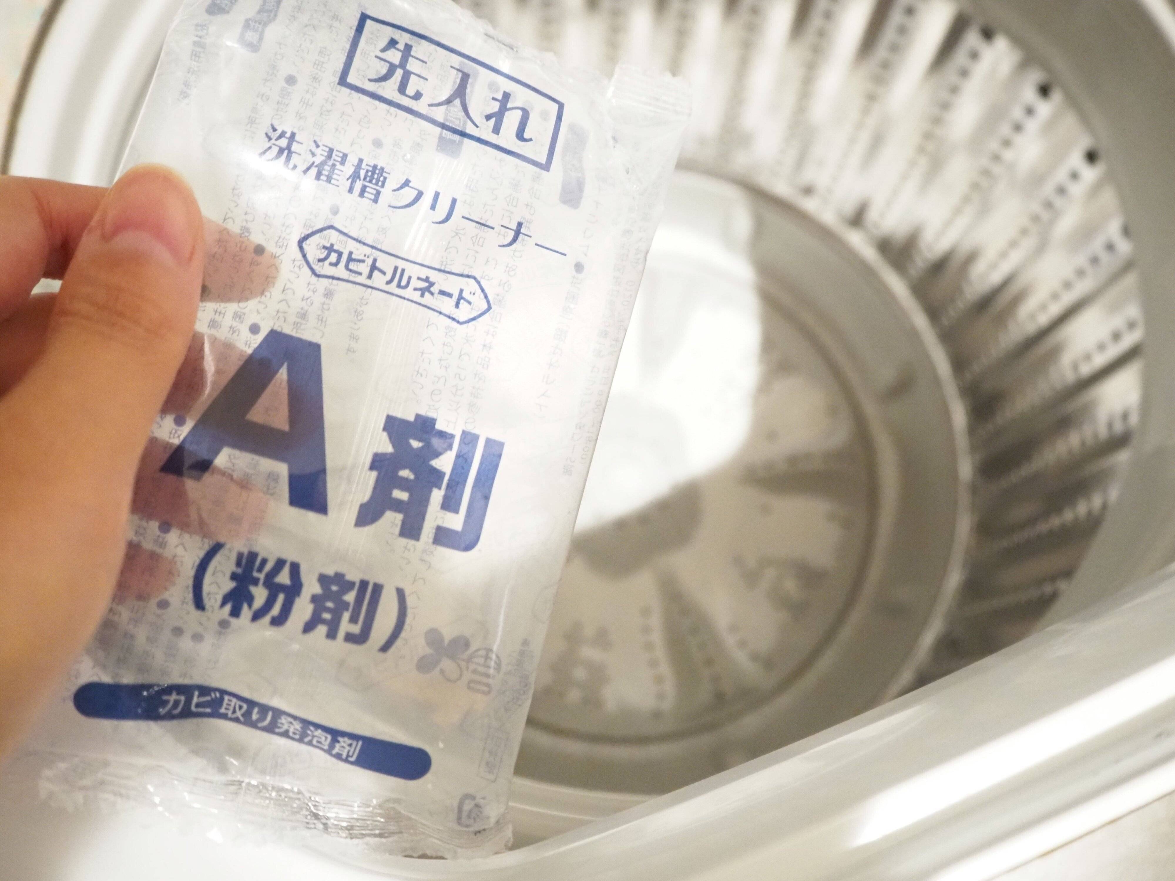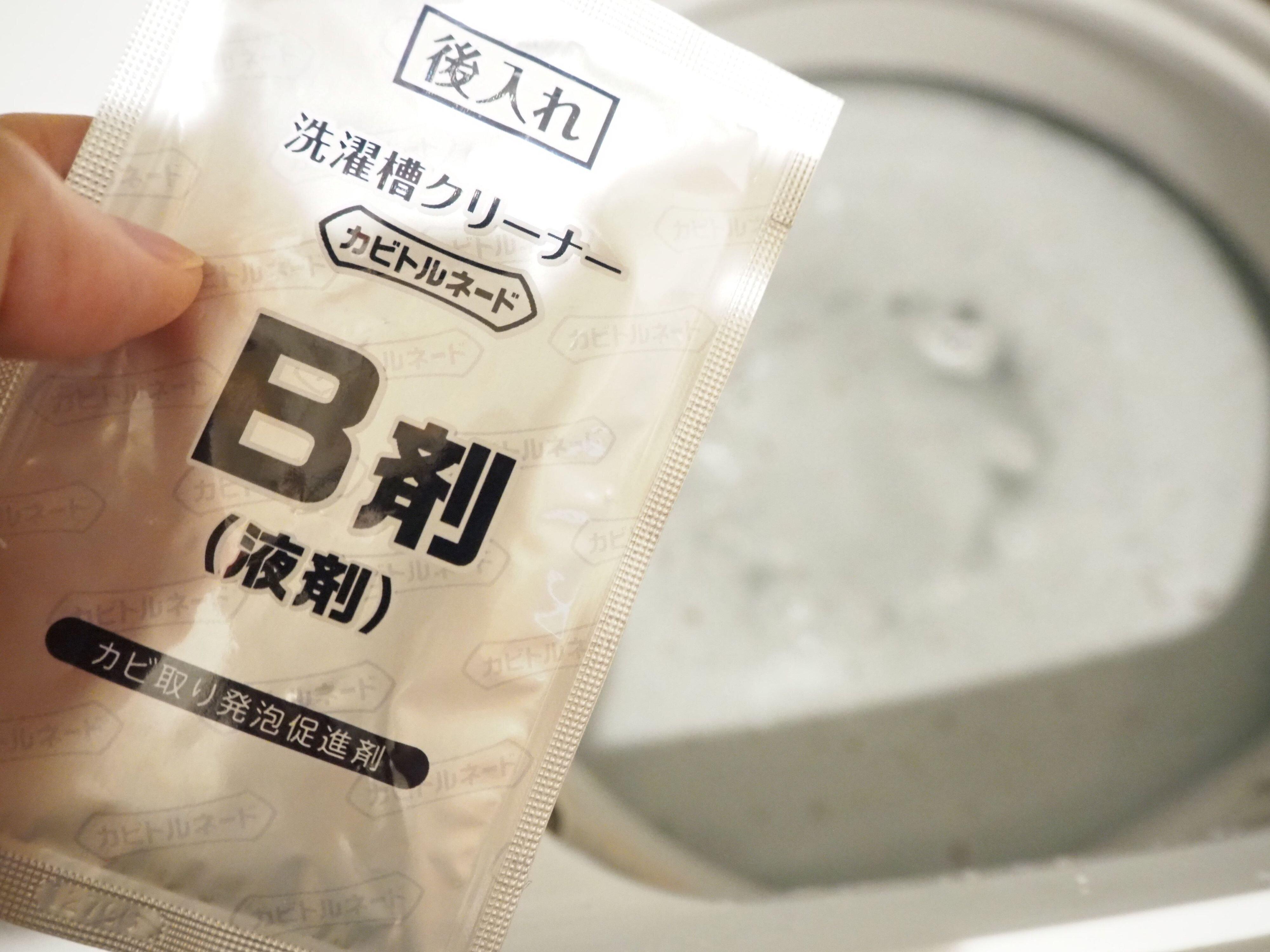 一時停止をしているうちB剤を全量投入。再度「洗い」で約5分運転したのち、すすぎと脱水を行えば完了です。