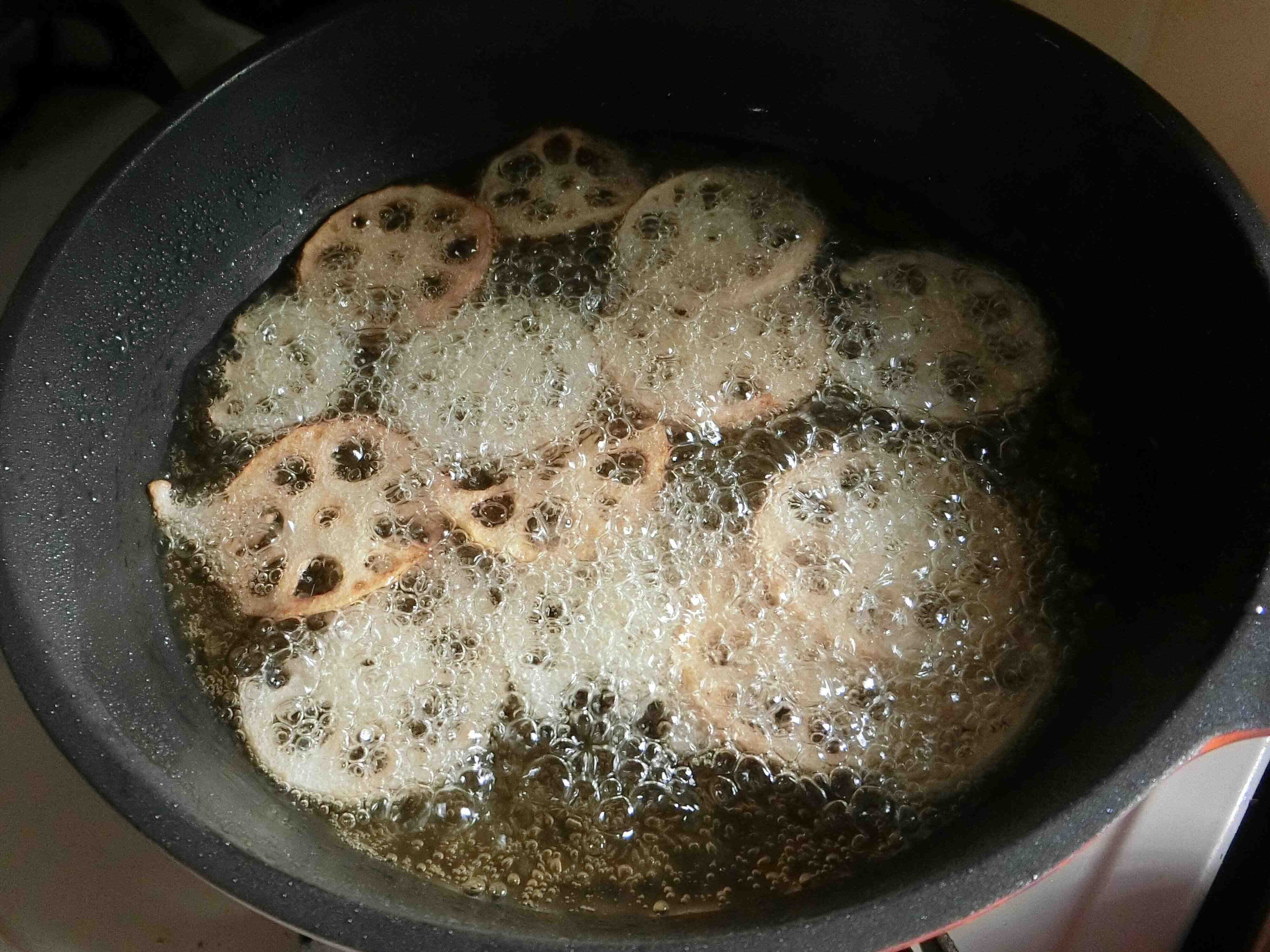 2.れんこんは皮をむいて薄切りにし酢水につけます。しっかり水気を切ったら油で揚げます。