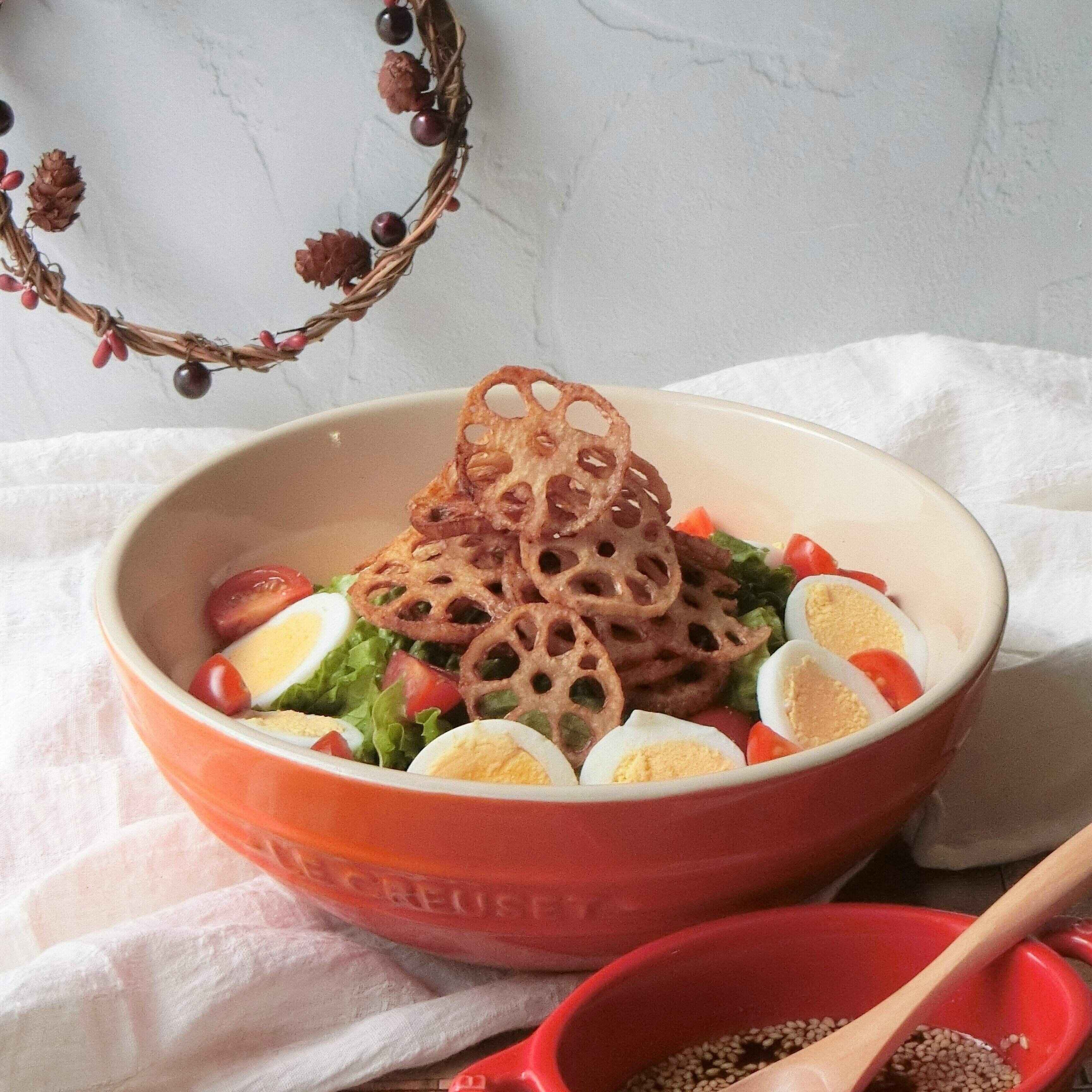3.器に【1】を盛り付け、レンコンを真ん中に積み上げるように盛りつけて完成。