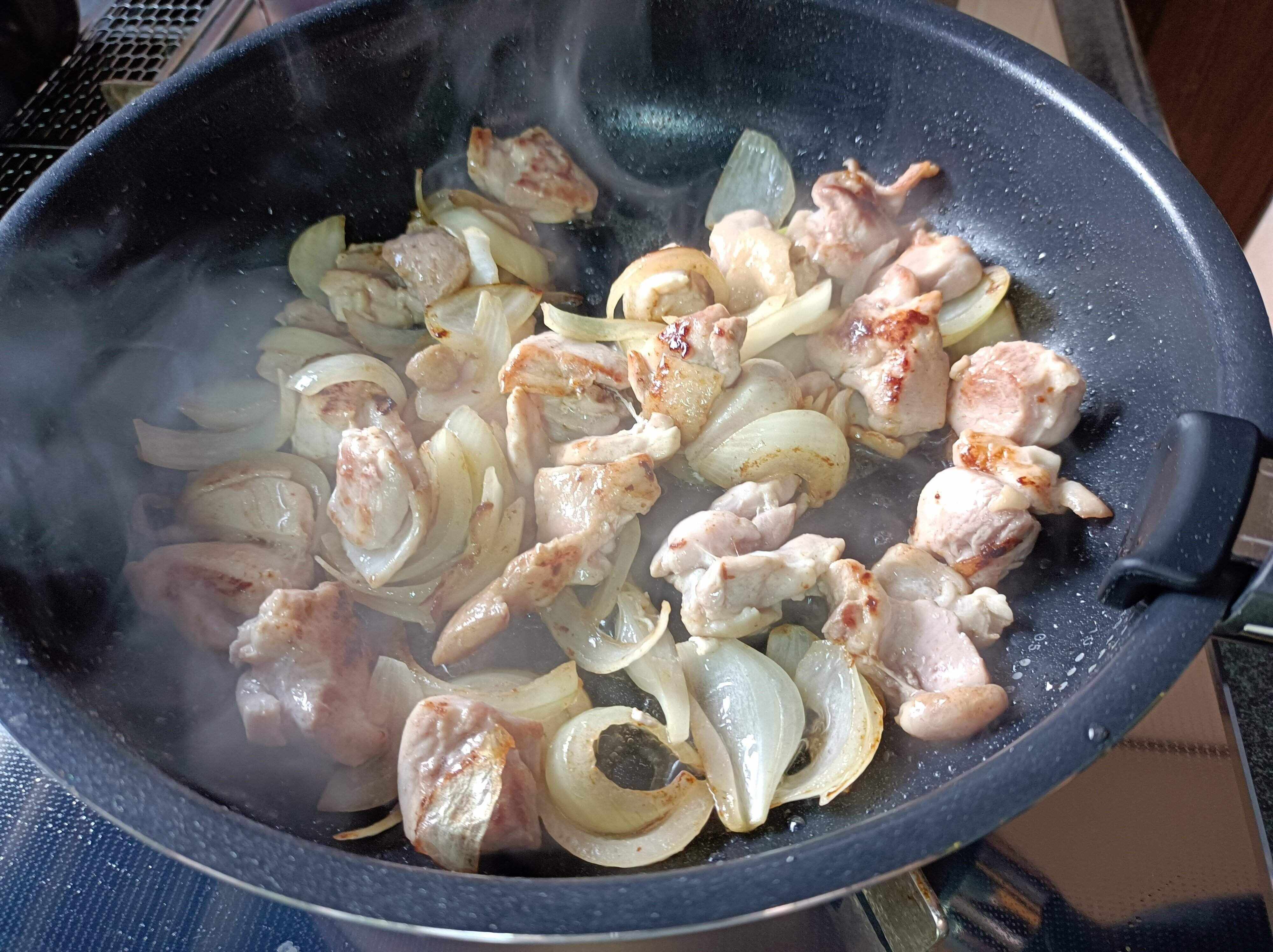 1 フライパンに油を敷き、鶏肉と玉ねぎを炒めます。