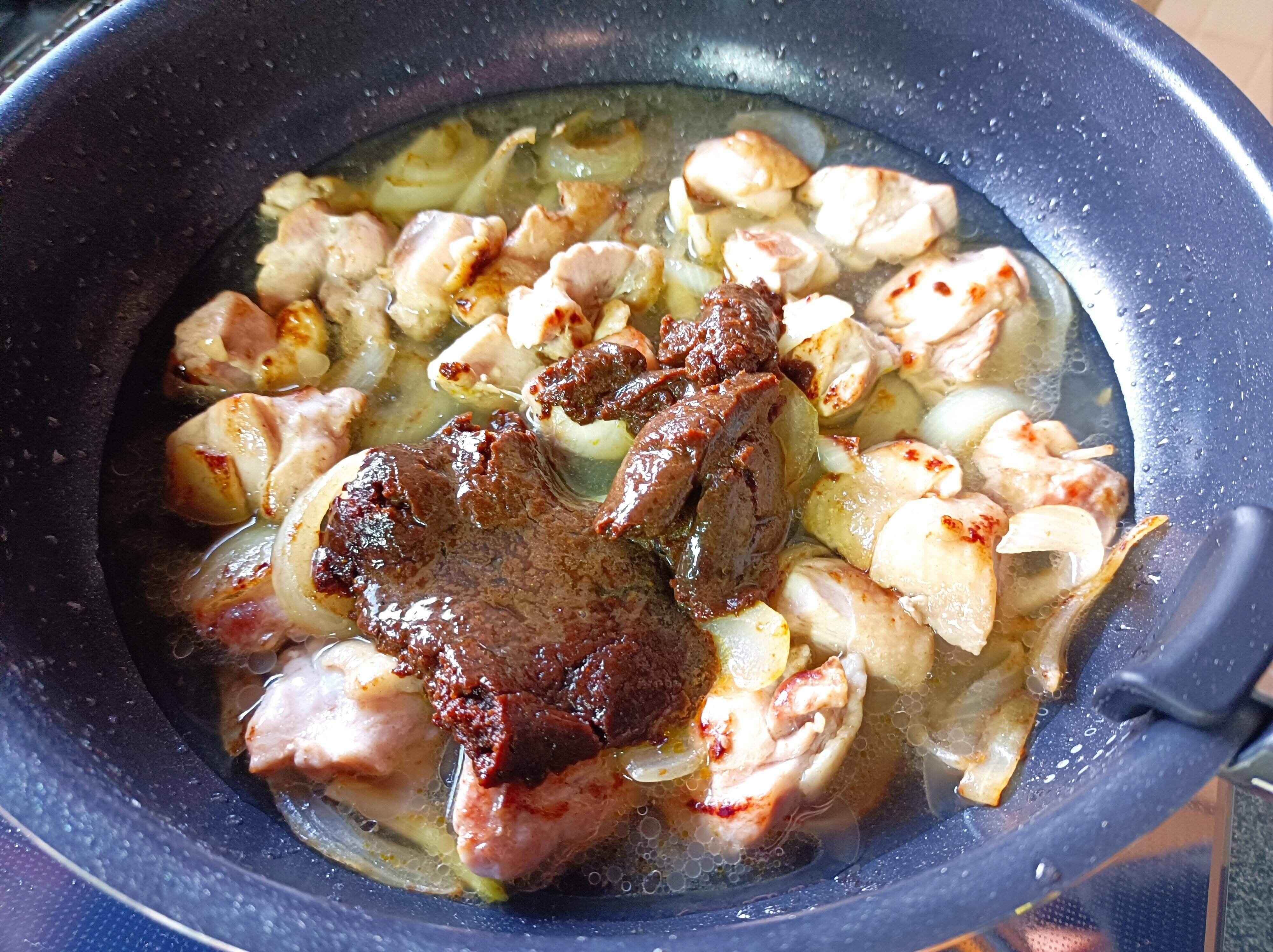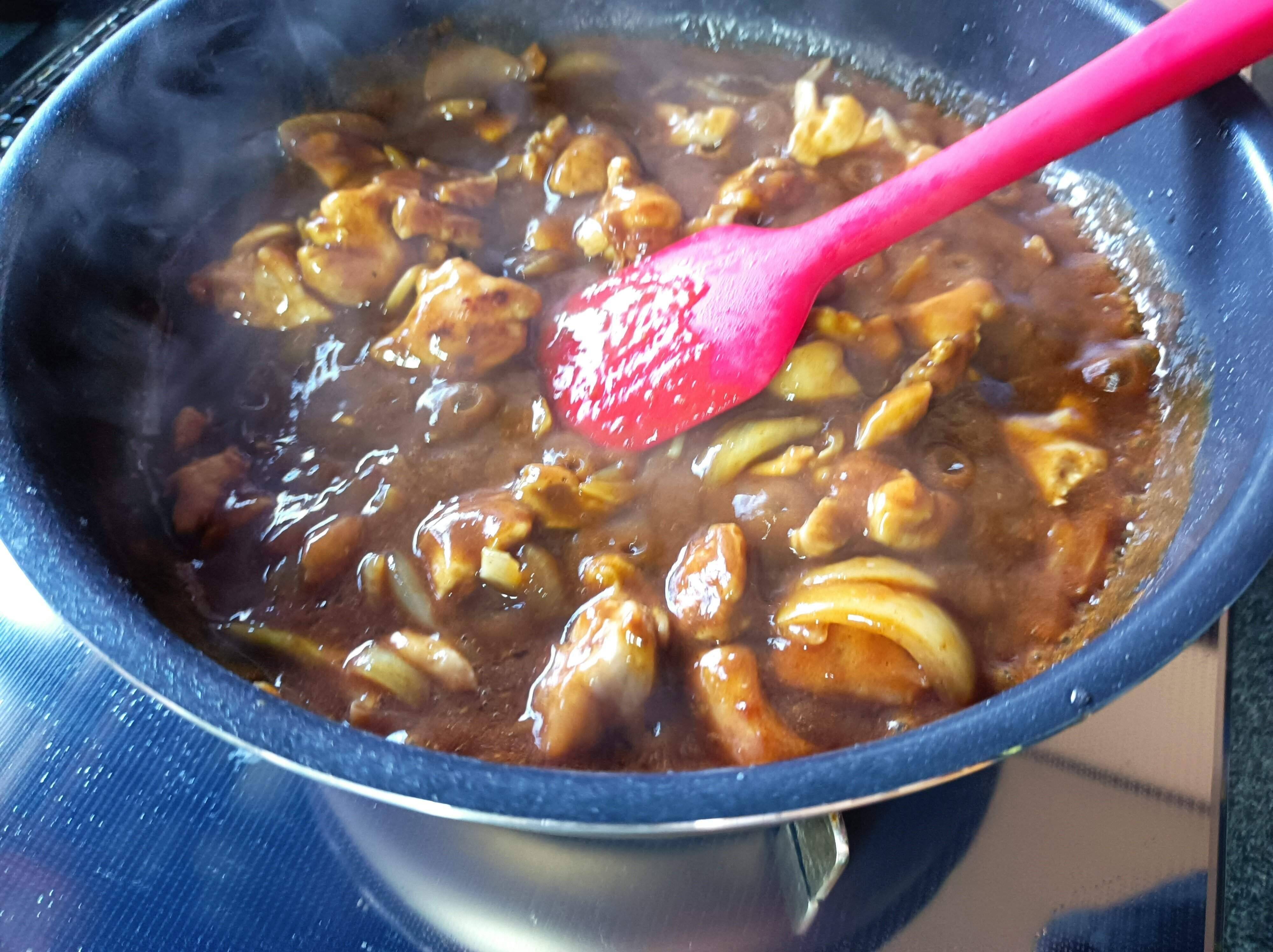 今回筆者は玉ねぎも加えてみたのですが、玉ねぎと鶏肉を5分ほど炒めてあとはこのルーと水を加えてとろみがついたらできあがりです。
