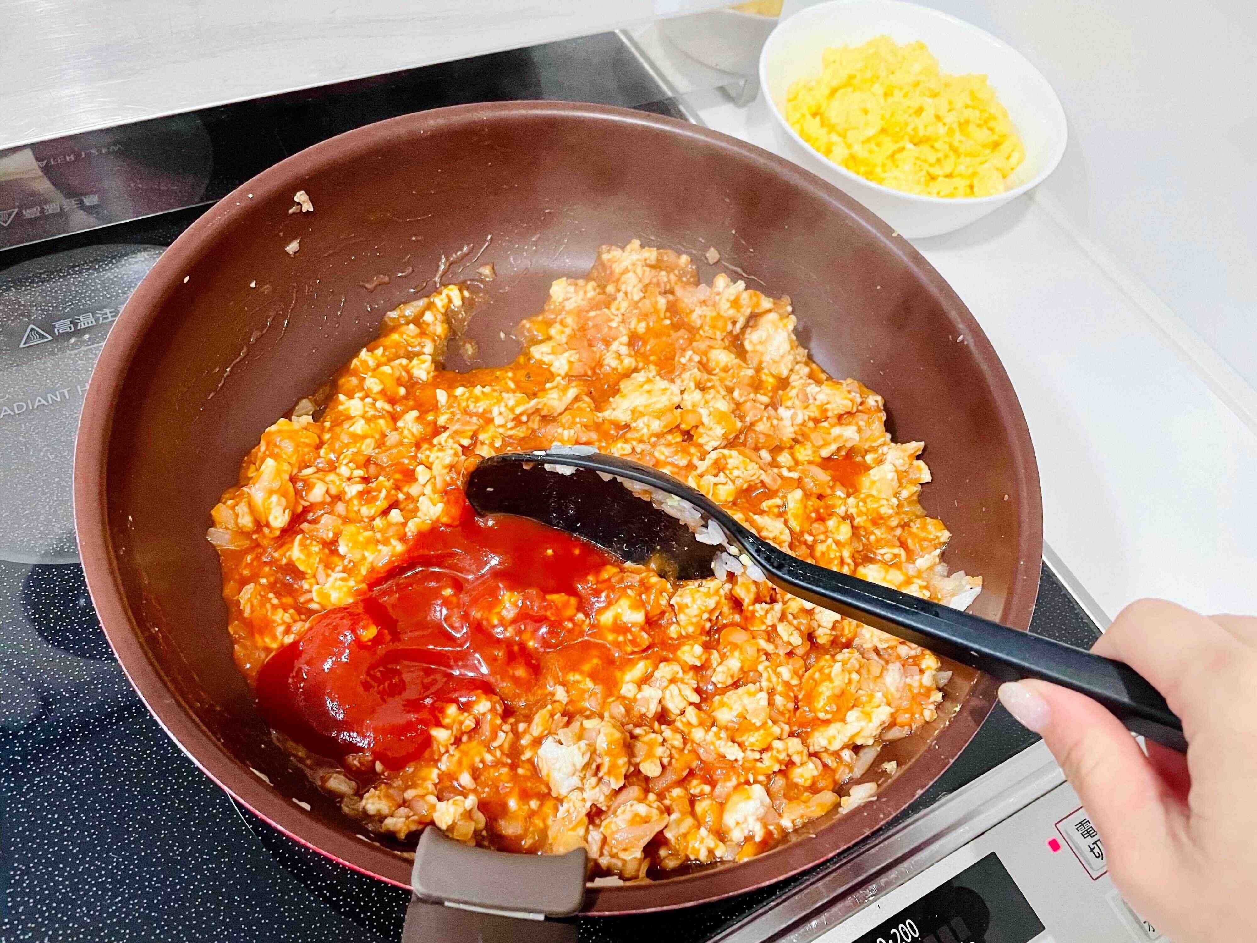 ケチャップを入れるのは、ご飯の前!よ〜く炒めておくことで、酸味が取れて旨みが増します。