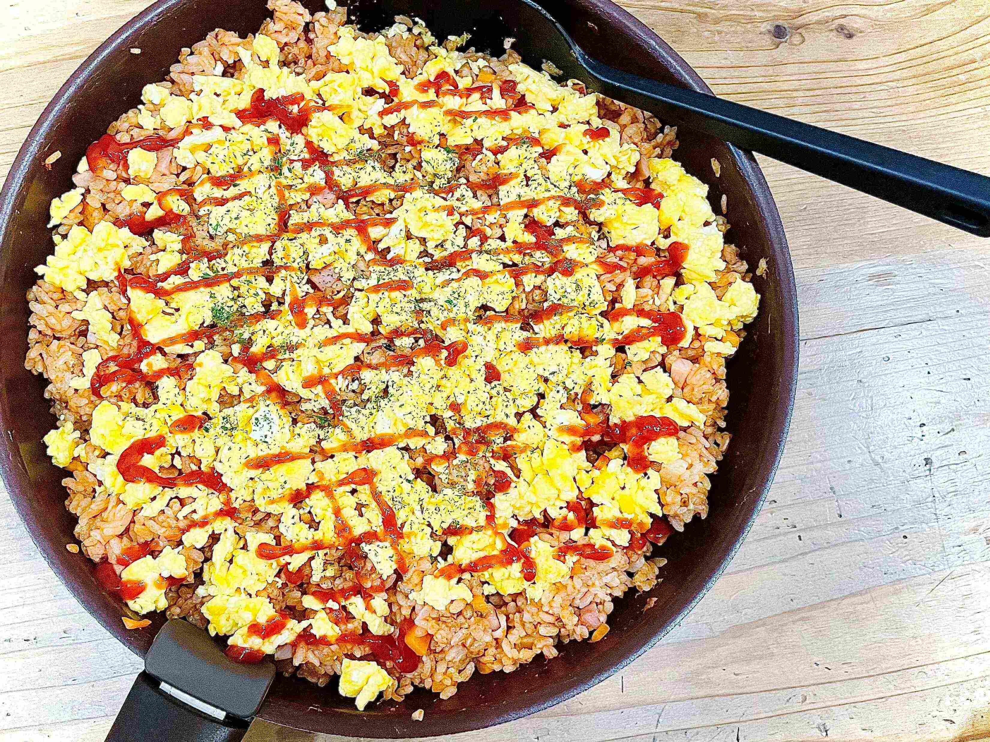 チキンライスができたら、あとは炒り卵を上にのせるだけ。ケチャップとパセリをかけて、『包まないオムライス』の完成です!おいしそう!