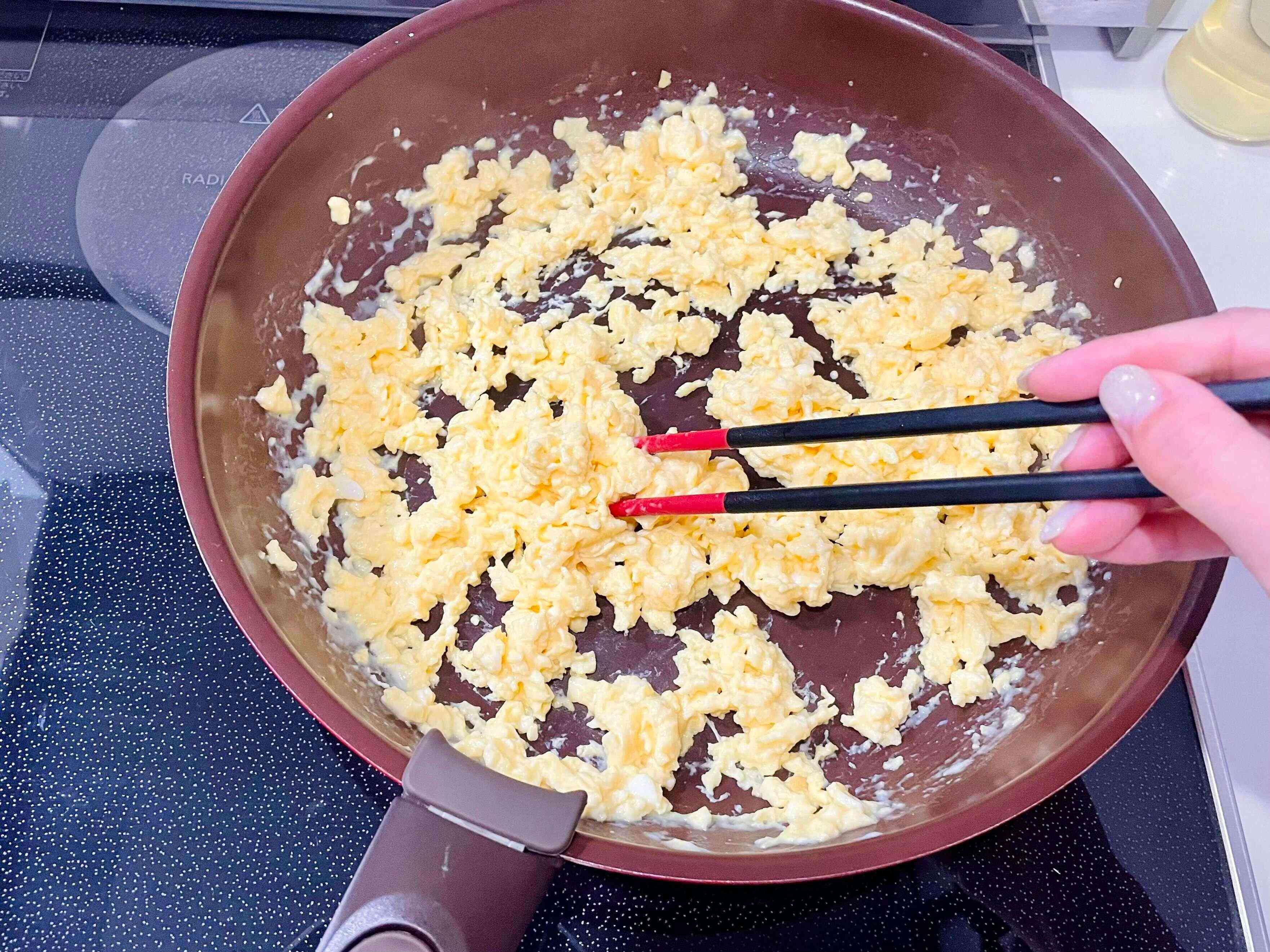 まずは、炒り卵をつくります。ポイントは、卵をケチらずに使うこと!卵たっぷりの方が、断然おいしいです!