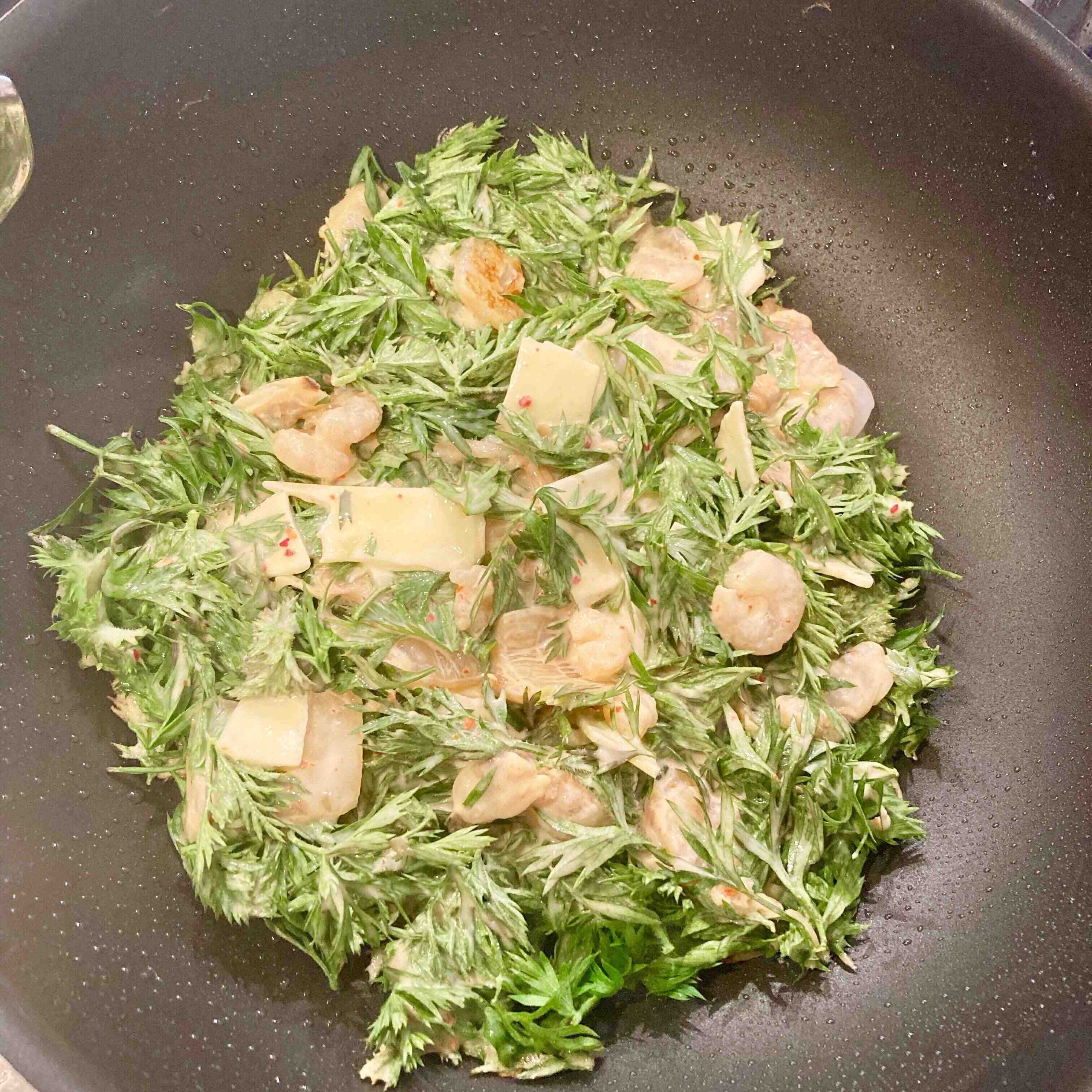 混ざったらにんじんの葉とシーフードミックス、キムチを入れよく生地にからませます。