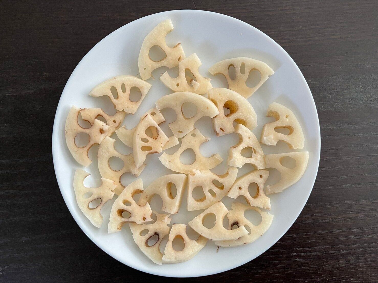 (1)れんこんの皮を剥いて5mm~1cmほどの厚さの半月切りにする。
