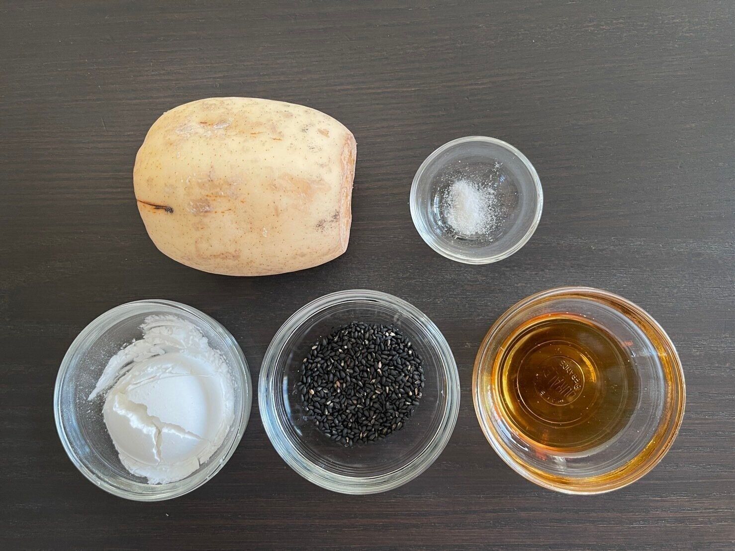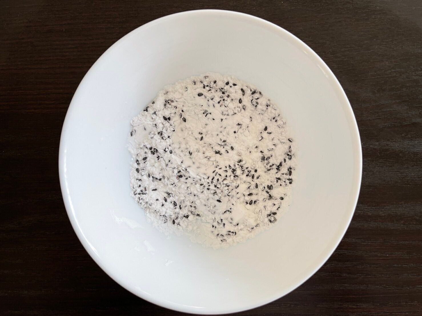 (2)片栗粉と黒ごまをよく混ぜ合わせる。