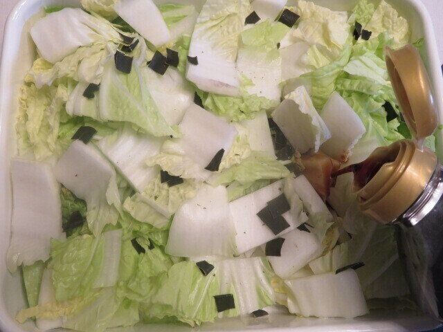 白菜を一口大に切り、保存容器やジッパーつきの保存袋に入れてキッチンばさみで切り刻んだ昆布を散らします。