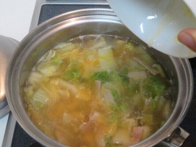 とろみがついてきたら、溶き卵2個分を流し入れて卵がかたまったら火を止めます。