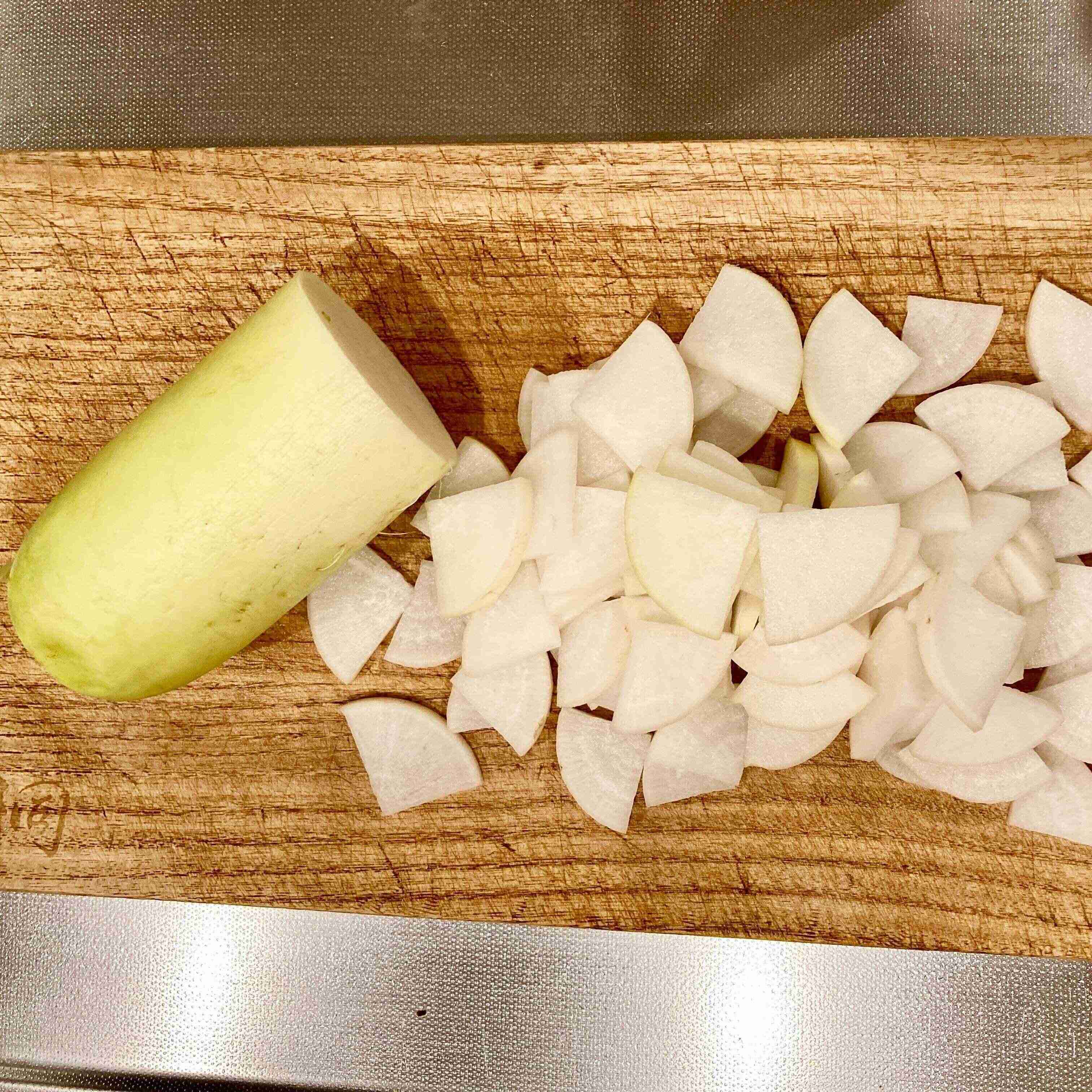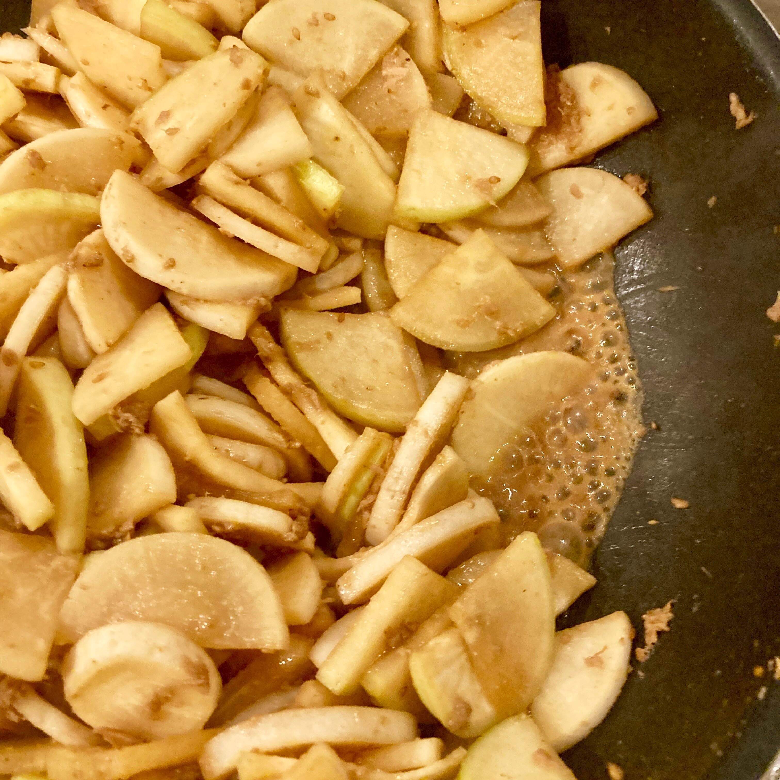 大根を、いちょう切りにします。厚みは5〜8mm程、少し厚みのある方が食べ応えがあります。切った大根をフライパンで炒めツナ缶を入れます。缶の油も汁も全て入れましょう。