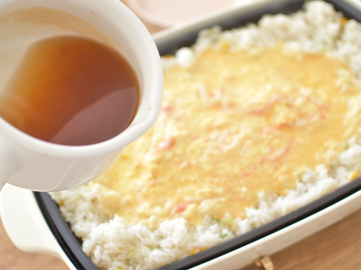 4.チャーハンの真ん中を空けて堤防を作ります。ごま油をなじませたらホットプレートの温度を強にして卵を一気に加え、菜箸でかきまぜて蓋をしめます。