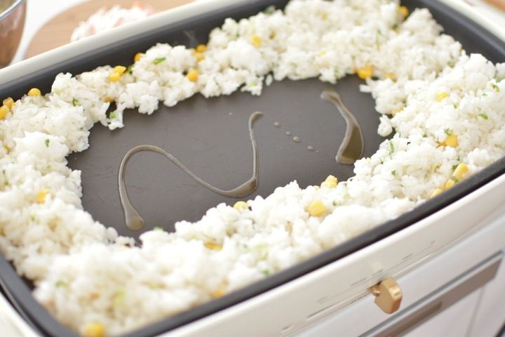 2.ホットプレートを温めて、分量外のごま油をなじませたらご飯、ねぎなどを加えてチャーハンの要領で炒めて軽く味付けをします。