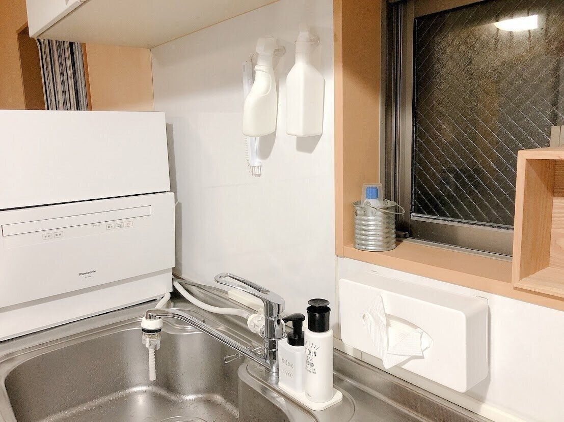 手拭き用のペーパータオルや洗剤の位置も食洗機を置いたので少し変更しています。
