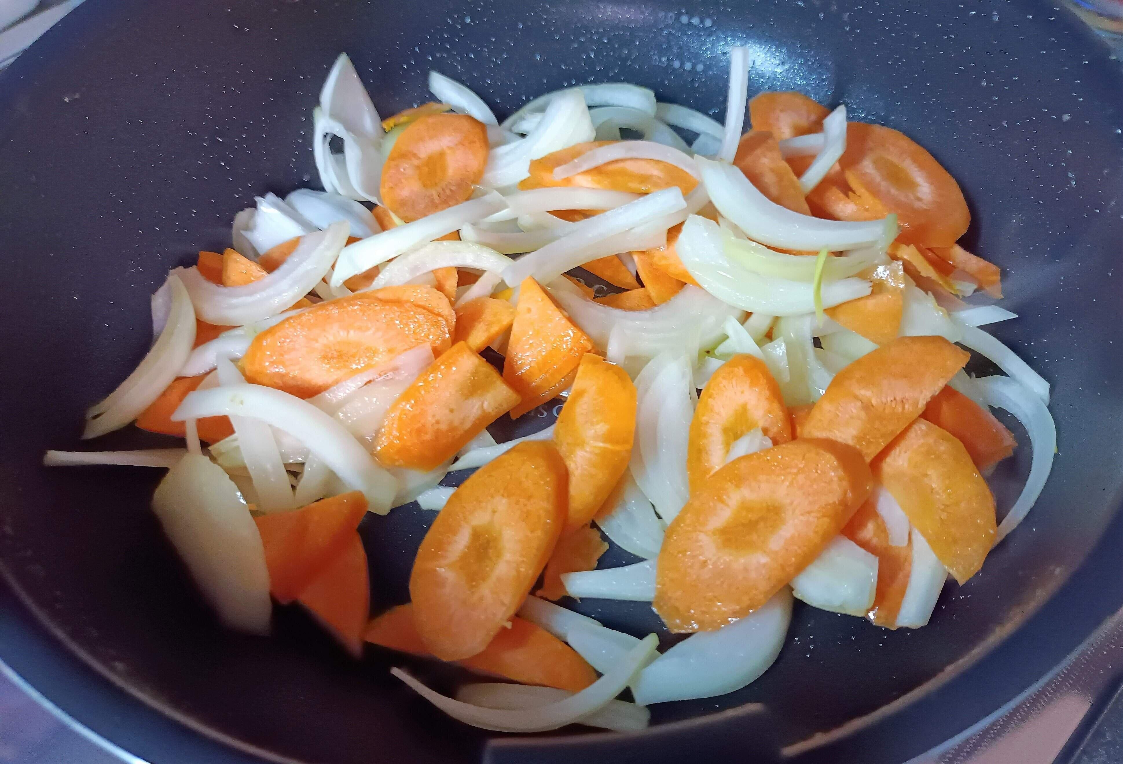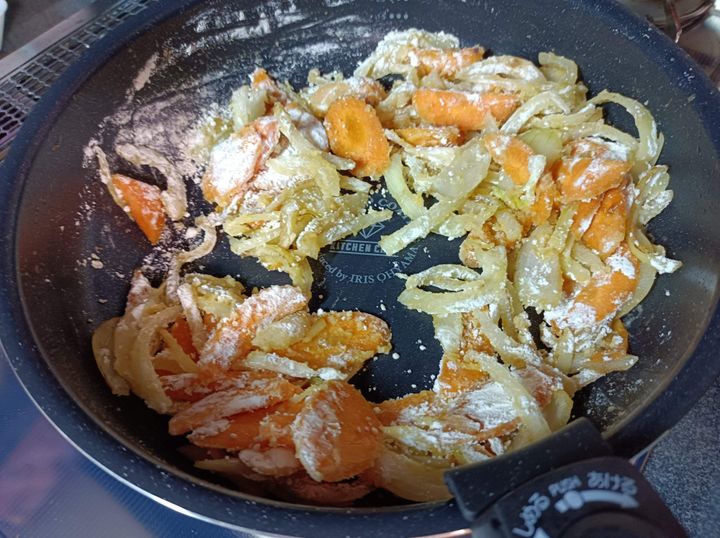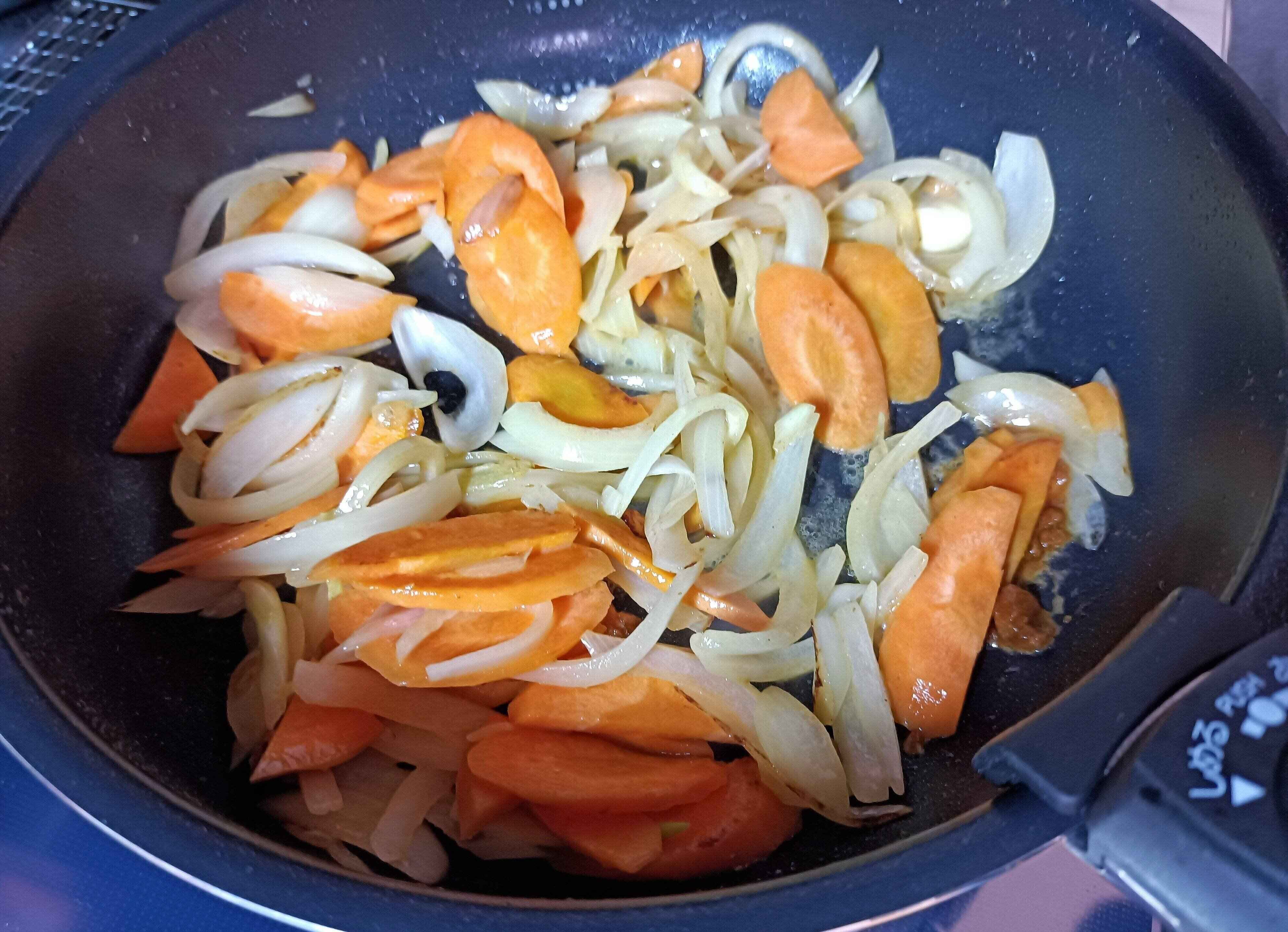 3. フライパンは洗わずに、そのまま玉ねぎと人参をいれて炒めます。