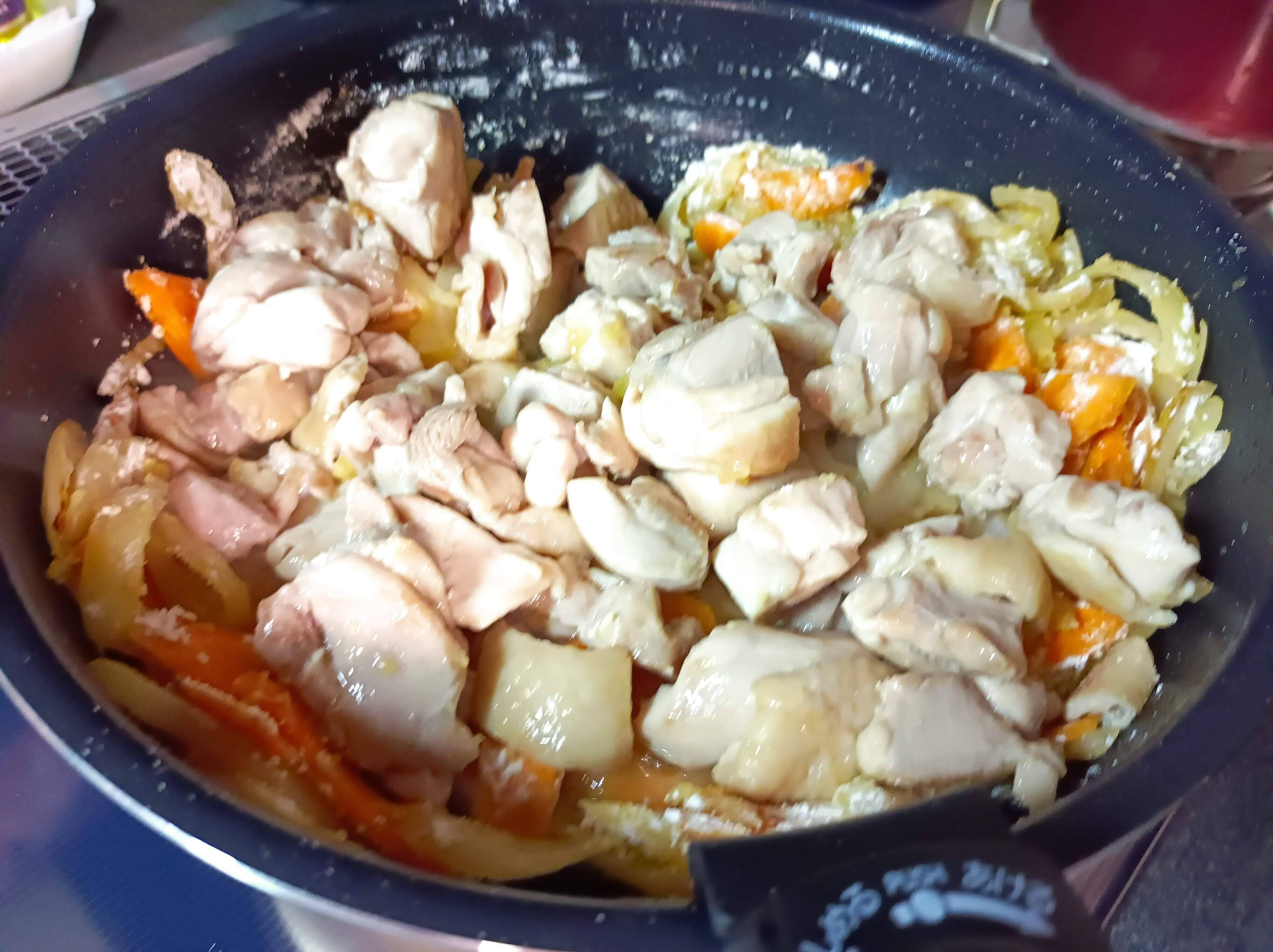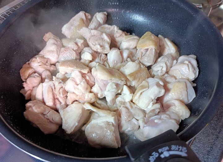 2. フライパンに油を敷き、鶏もも肉を炒めます。火が通ったら、ボウルに一旦取り出します。