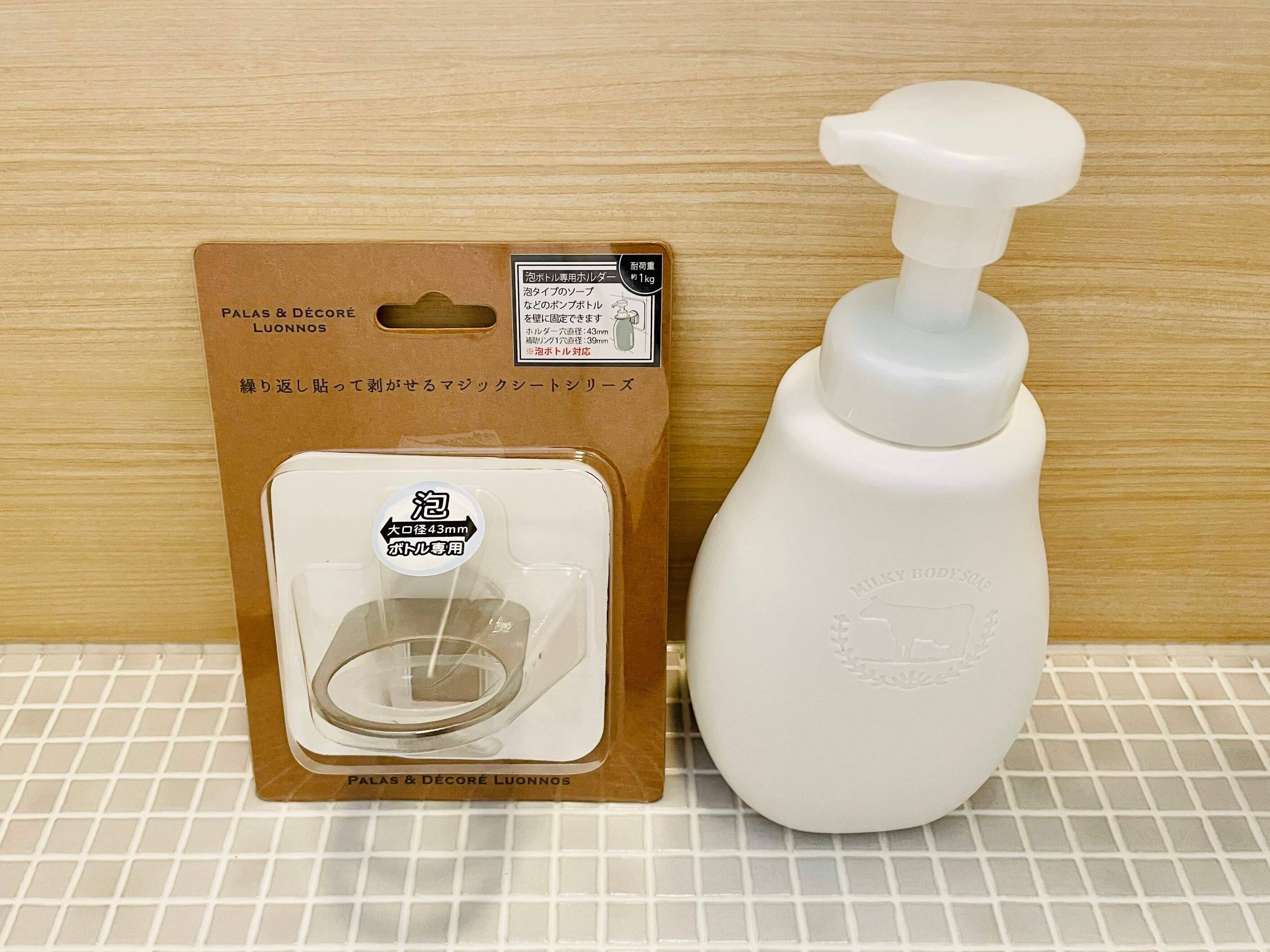 泡ボディソープはボトルの口径が大きく、100均には合うものがなかったので、【オテル】の「マジックシート 泡ソープホルダー/1,650円」で浮かせています。こちらも、繰り返し貼ってはがせるタイプ。