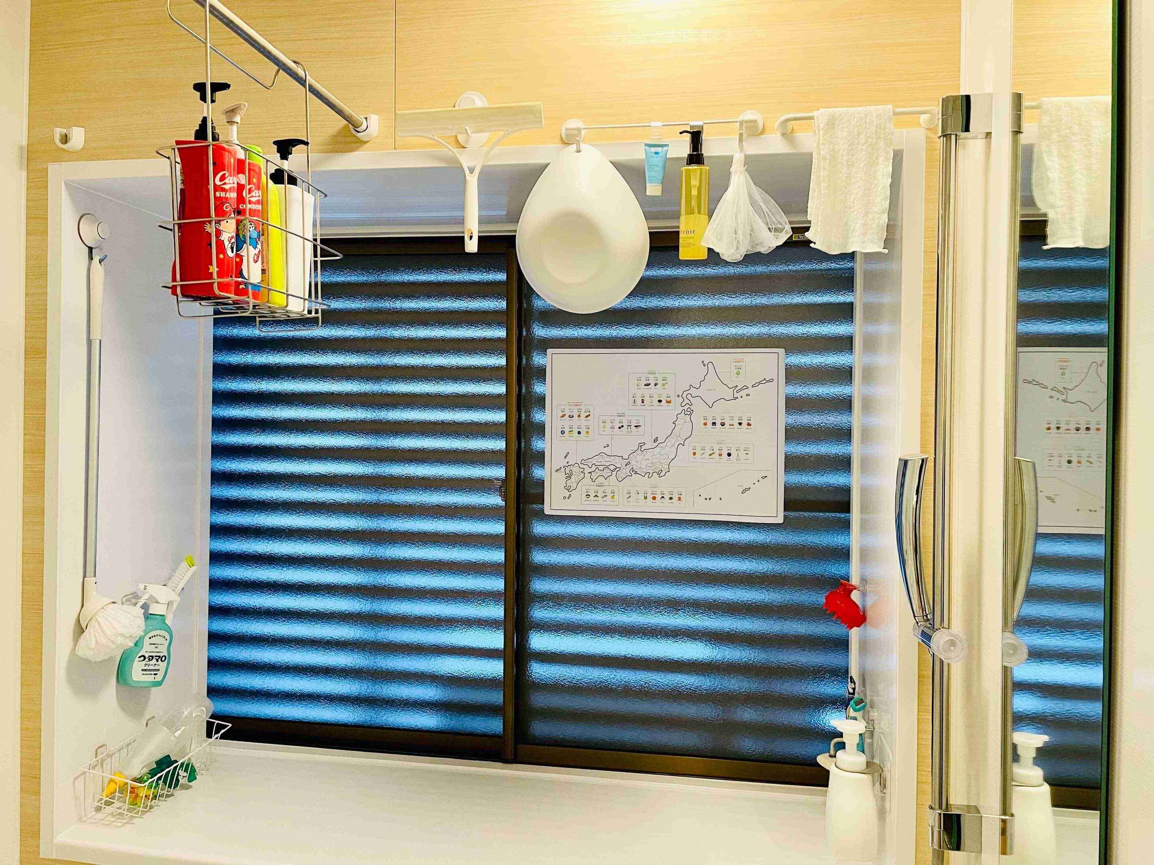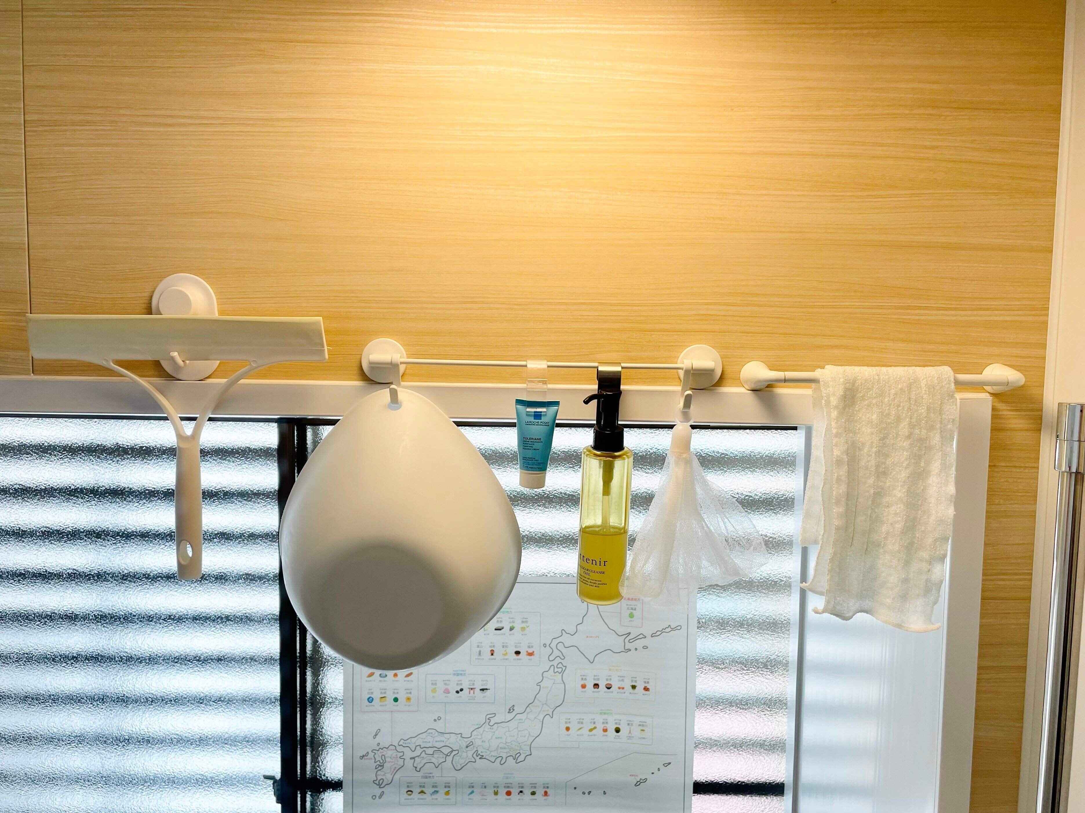 洗面器などの小物は、【ニトリ】「浴室マグネット」のタオルバーとフックを使って浮かせています。