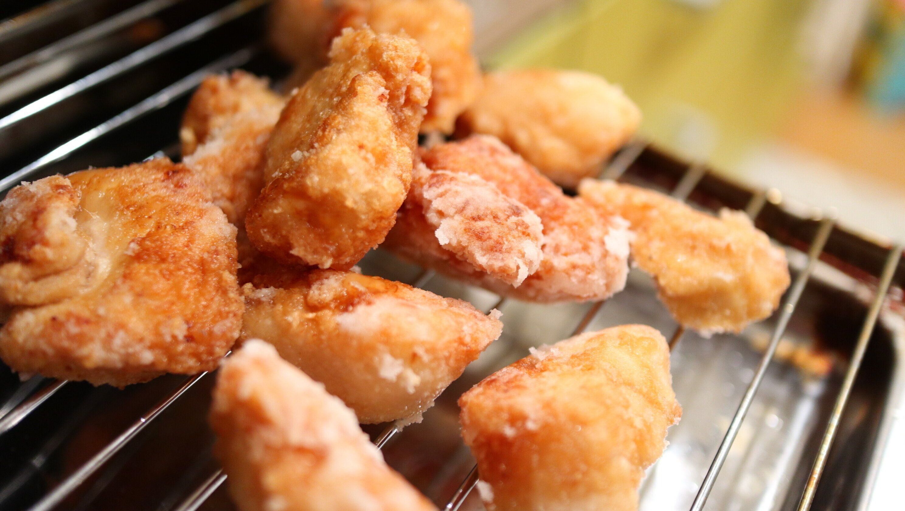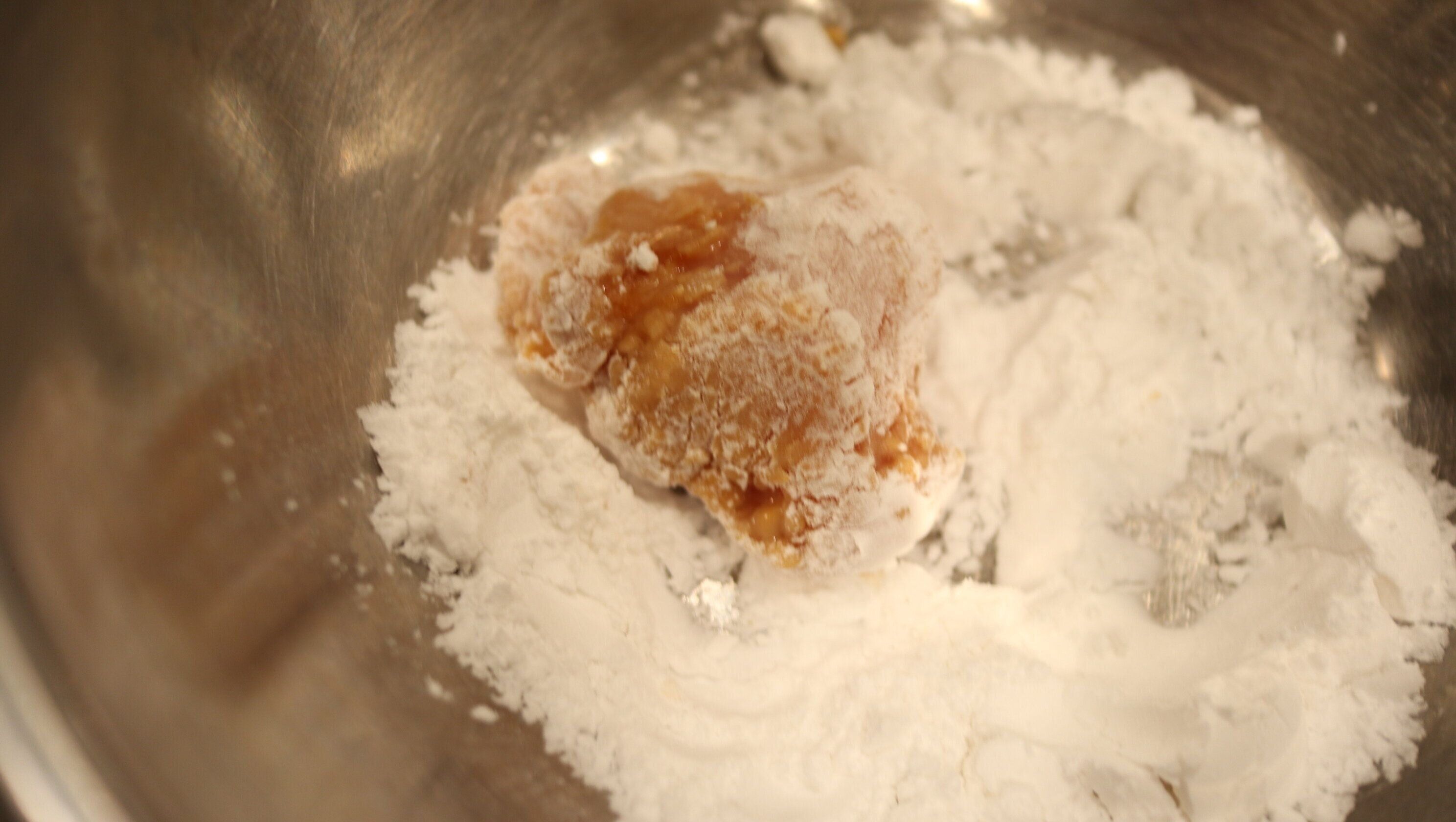 15分経ったら、片栗粉(大さじ5)をまんべんなくまぶし、油で揚げていきます。