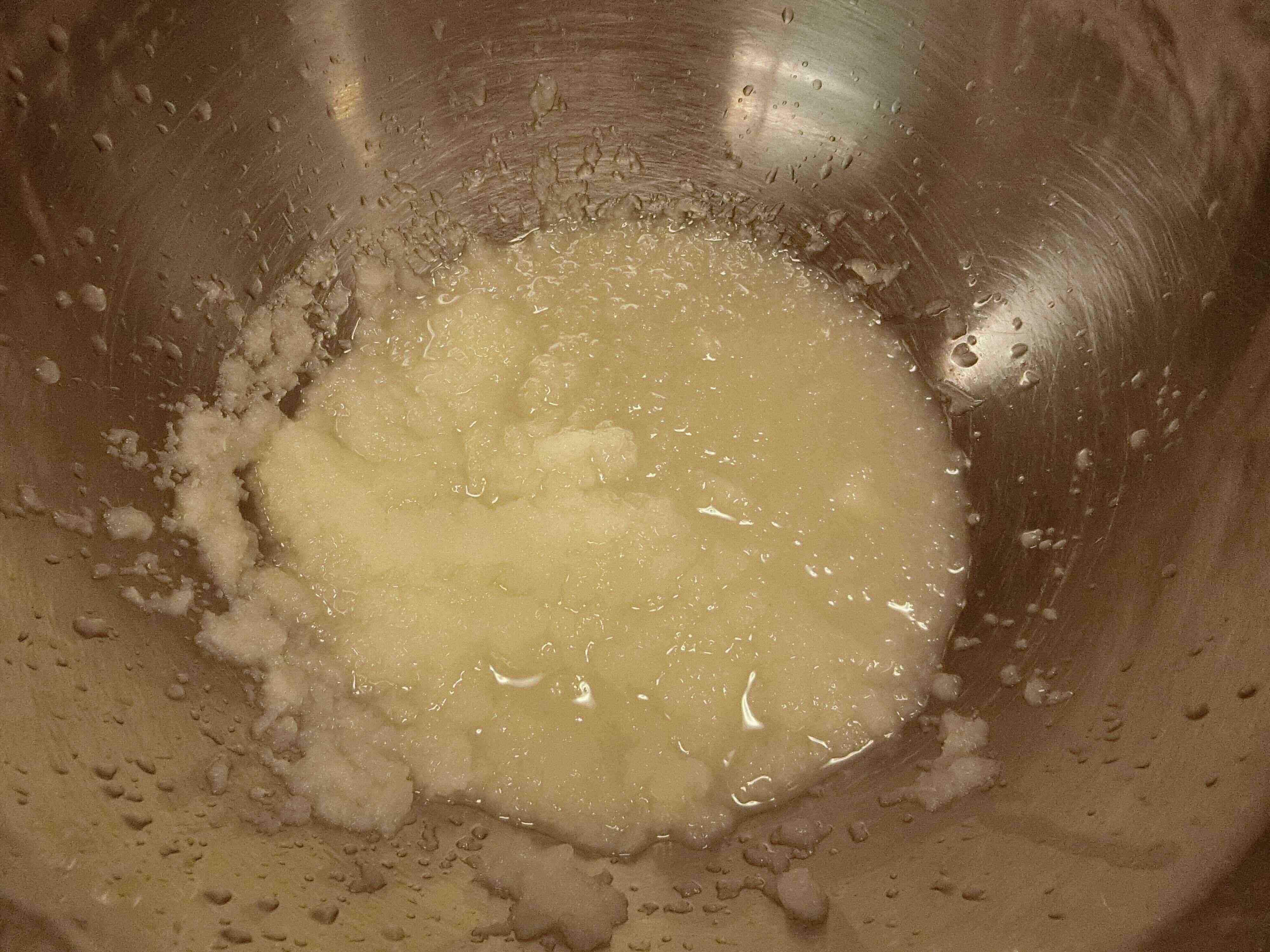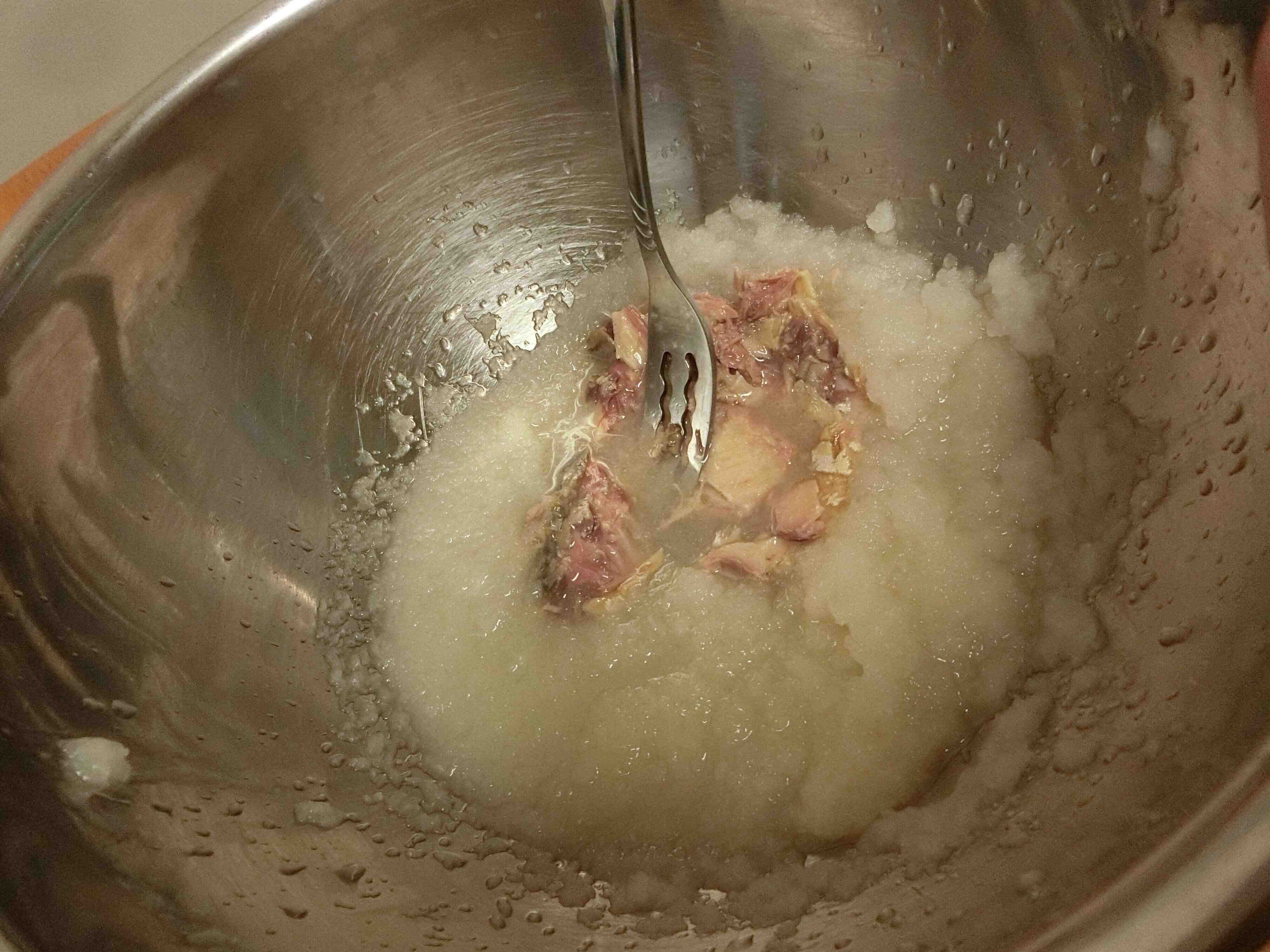 2.サバ缶を汁ごと入れ、崩しながら混ぜ合わせます。混ざったら、片栗粉と薄力粉も混ぜ合わせます。