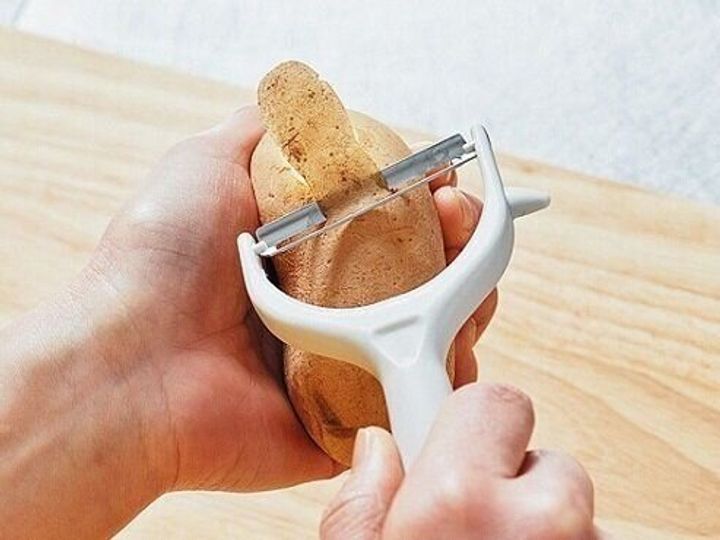 「生のじゃがいもって結構硬いし、ゴツゴツしてるし、ピーラーで皮をむこうとすると刃が引っかかるんですよね……。でも、これなら力を入れなくてもスルッとむける! この斜め刃がポイントですね」(ほりえさん)