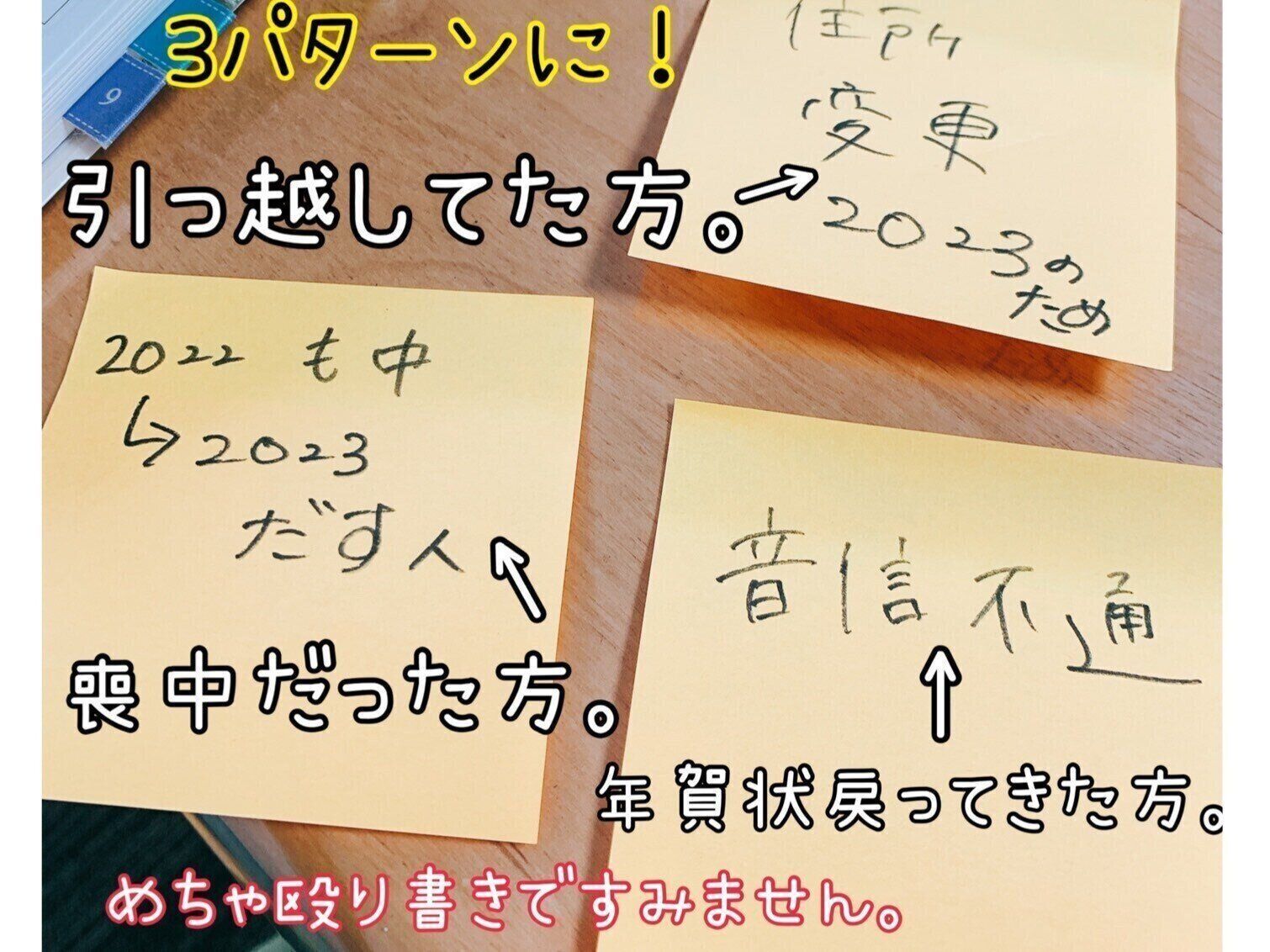 「住所変更した方」「2022年は喪中だったけど2023年は出す方」「音信不通の方」この3パターンです。毎年変わらず年賀状を出す方はひとまとめにし、それ以外のイレギュラーパターンに即時に対応できるようにしておくためです。