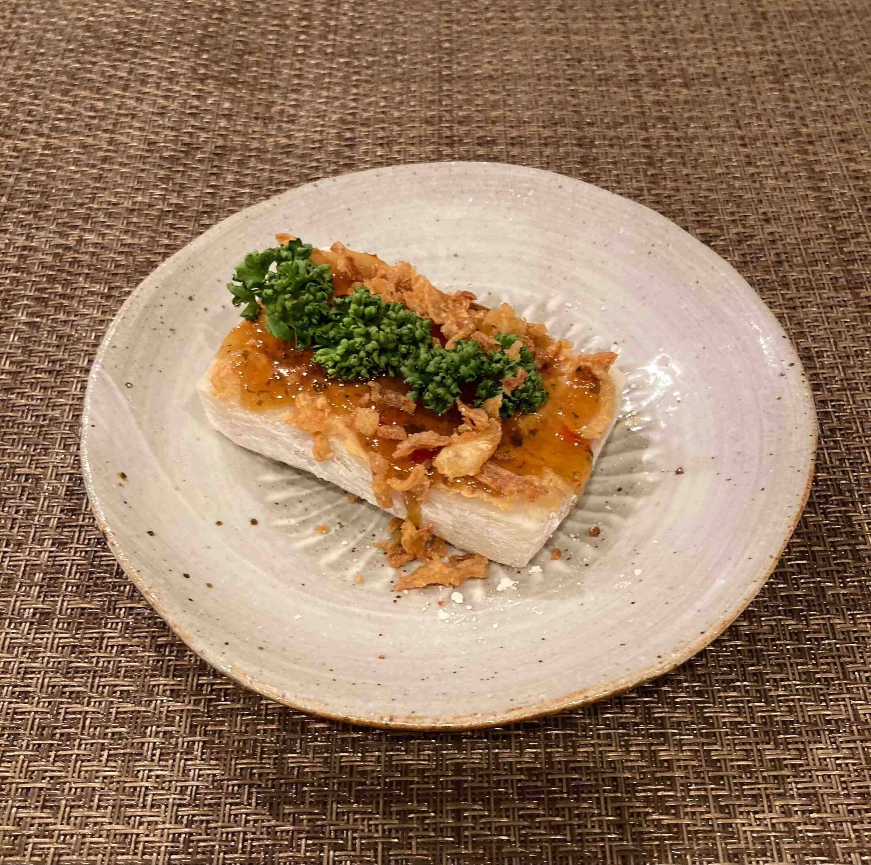 フライドオニオンをのせて、パクチーかパセリを飾ればできあがり!