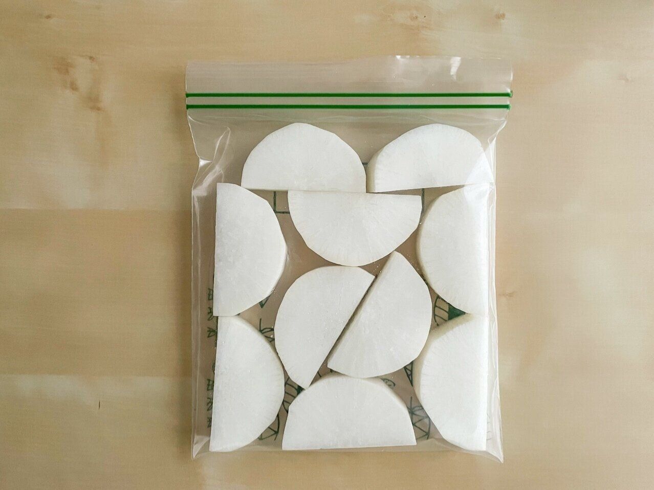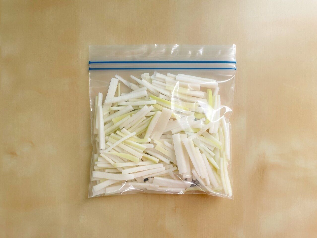 やわらかくてまっすぐな中1/3は、皮をむいたら1.5~2mm幅の半月切りに。保存袋に並べて入れて冷凍します。