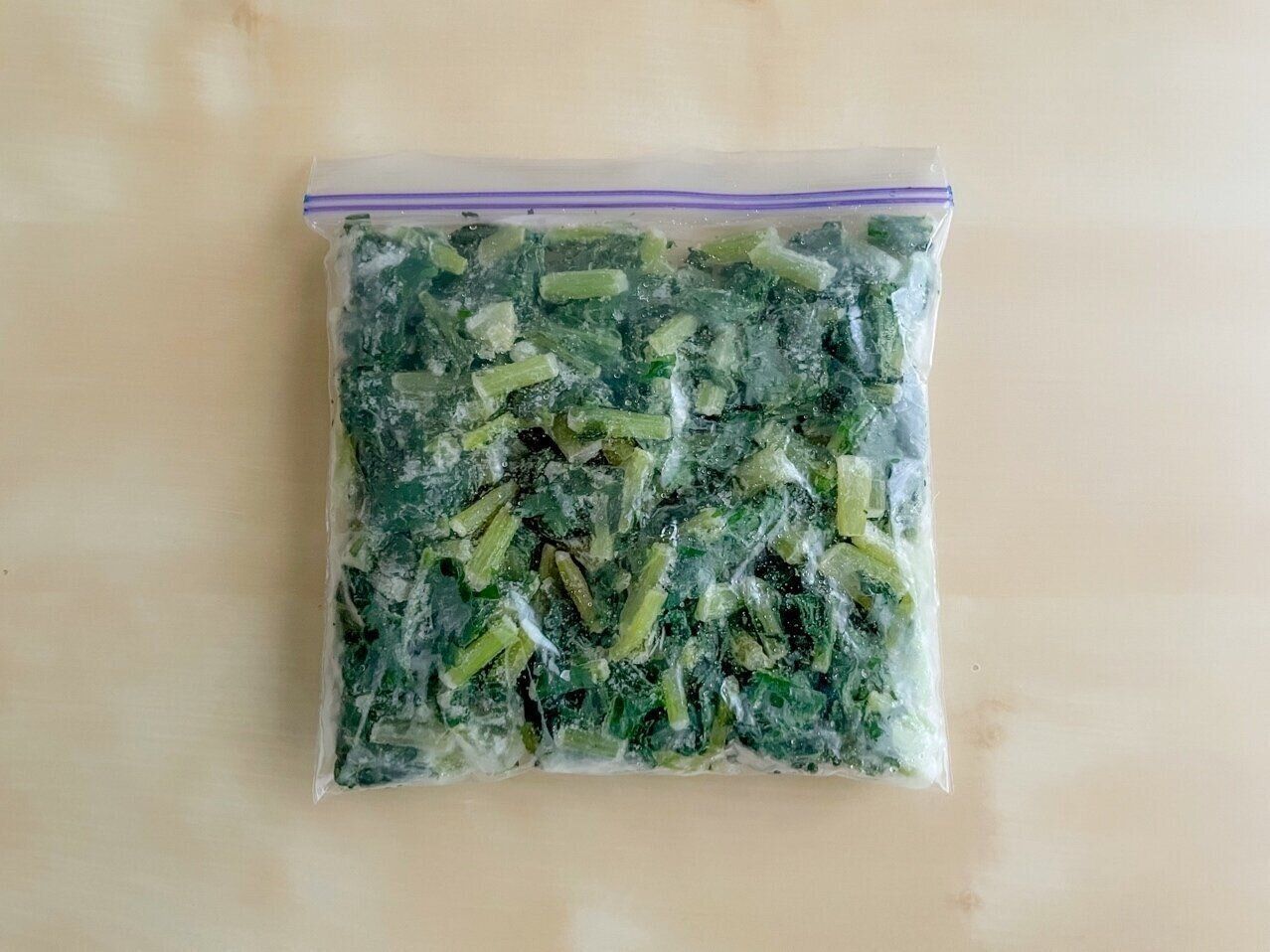 葉は2~3cm幅に切り、油を熱したフライパンでサッと炒めます。少し冷ましたら保存袋に入れて冷凍。