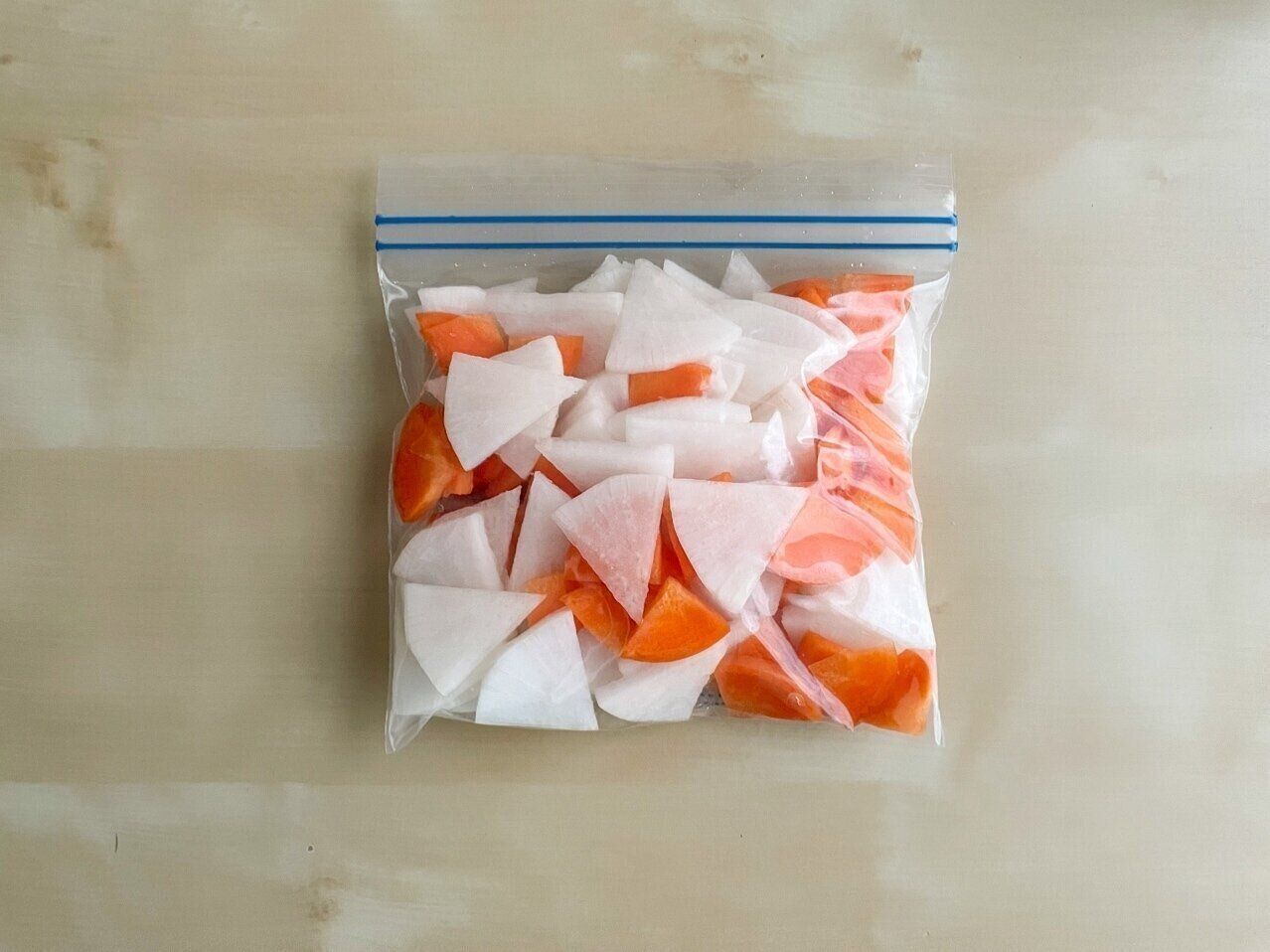 甘みの強い上1/3は、皮を厚めにむいたらいちょう切りに。同じくいちょう切りにしたにんじんとミックスして、保存袋に入れ冷凍します。