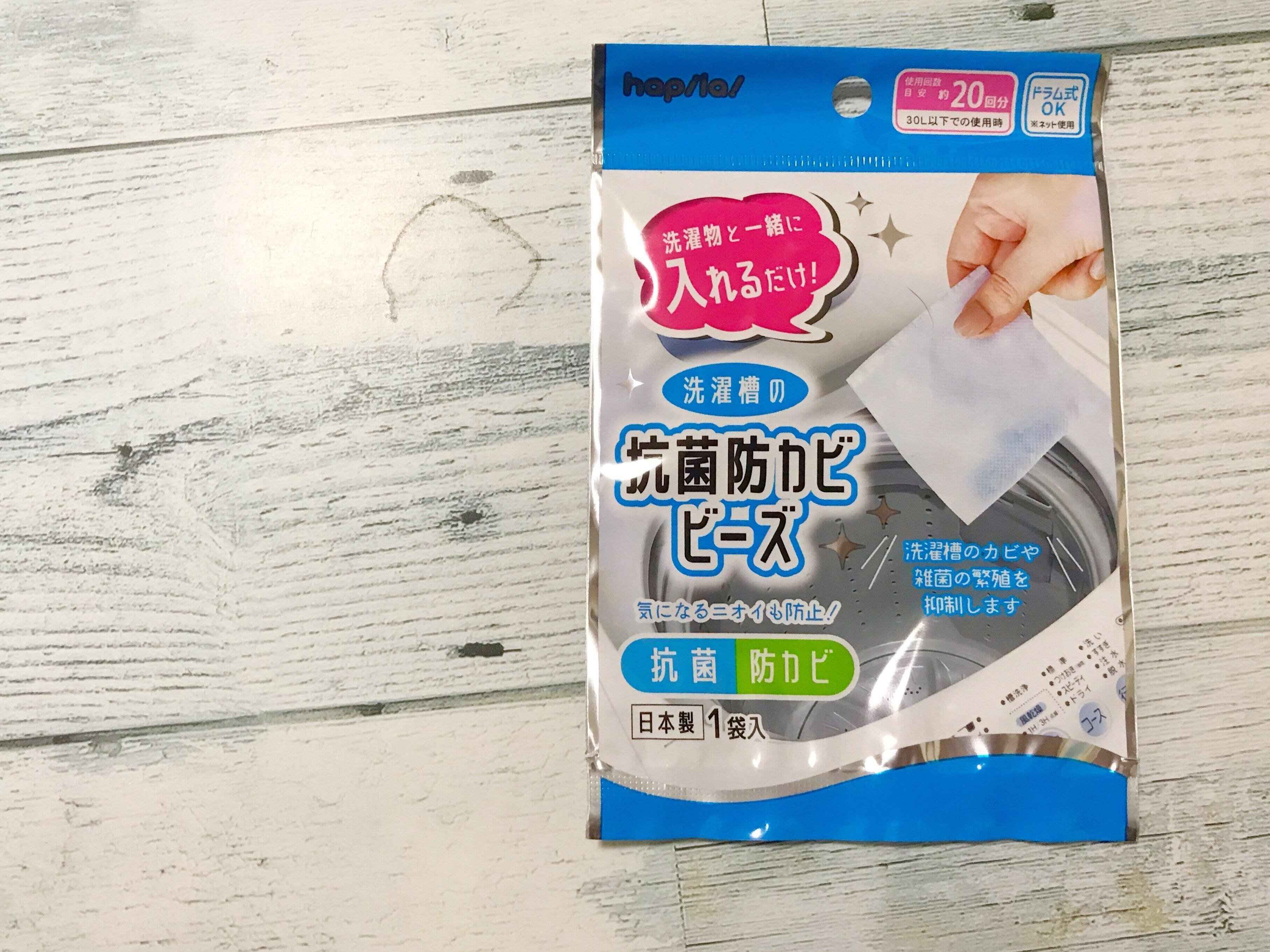 洗濯槽の汚れを落とした後の洗濯機におすすめなのが「洗濯槽の抗菌防カビビーズ」(110円)です。「洗濯槽の抗菌防カビビーズ」は、日々のお洗濯にプラスして使うアイテムで、洗濯物・洗剤(柔軟剤)と一緒に入れて脱水までします。