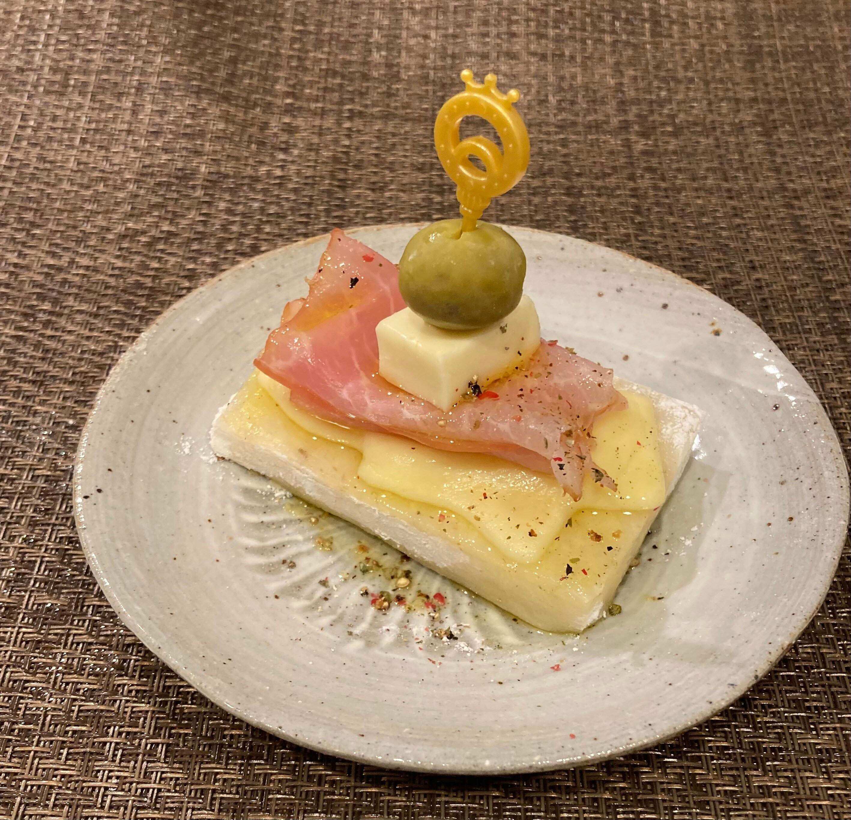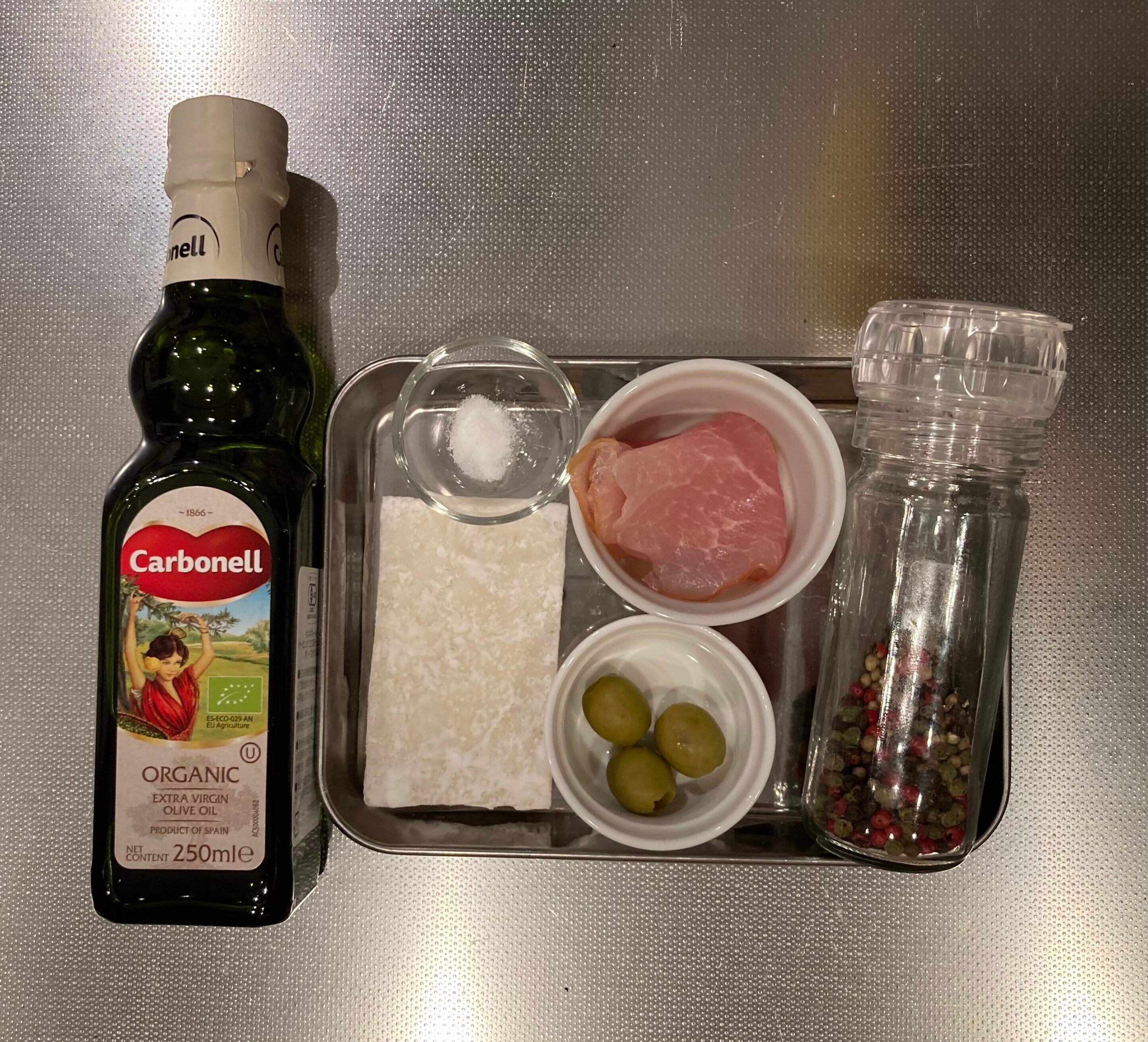 焼けたら生ハム、オリーブ、お好みでクリームチーズをのせて