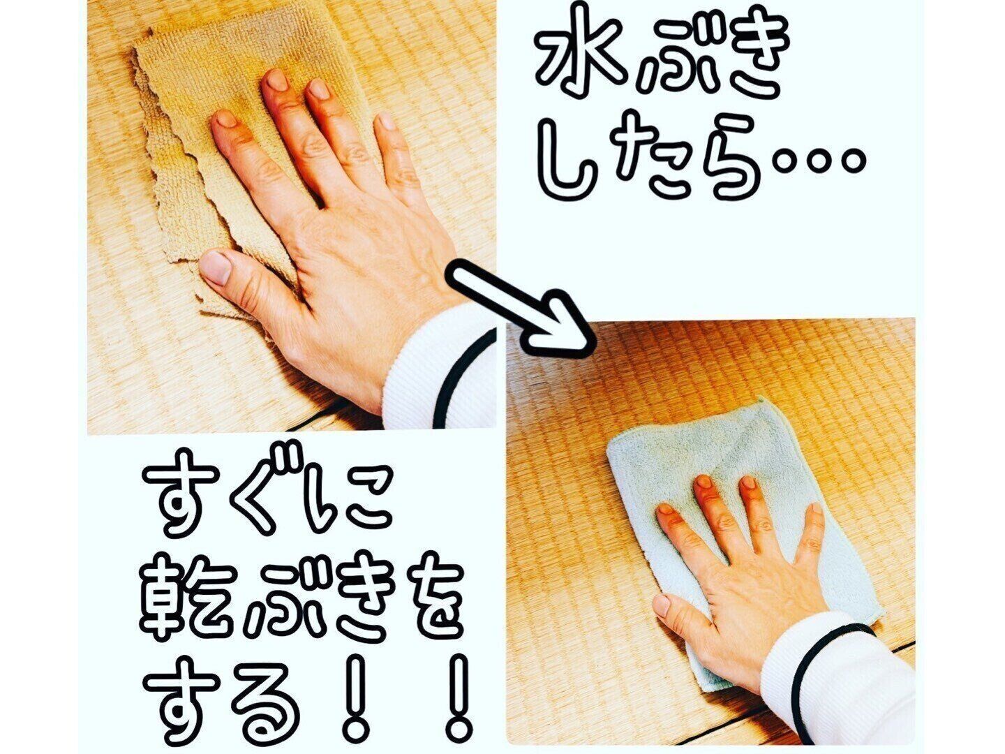 水拭きをしたら必ず乾拭きをしてください。とにかくたたみが湿っている時間を短くします。しっかり乾拭きをしておしまいです。晴れていればその後、換気まで出来たらいいですね。