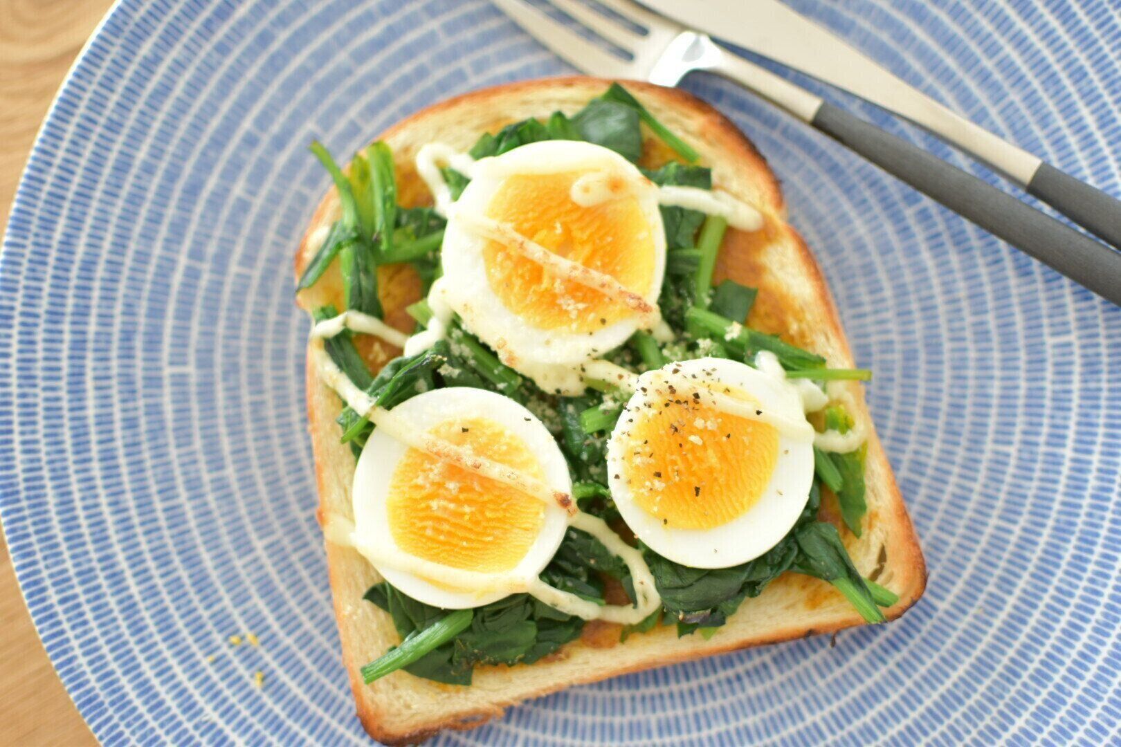ランチにもおすすめなのが、こちら。マスタードをたっぷり塗った食パンんに茹でたほうれん草とゆで卵のスライスを乗せたら、マヨネーズorチーズをトッピングして軽く焼いていただきます。