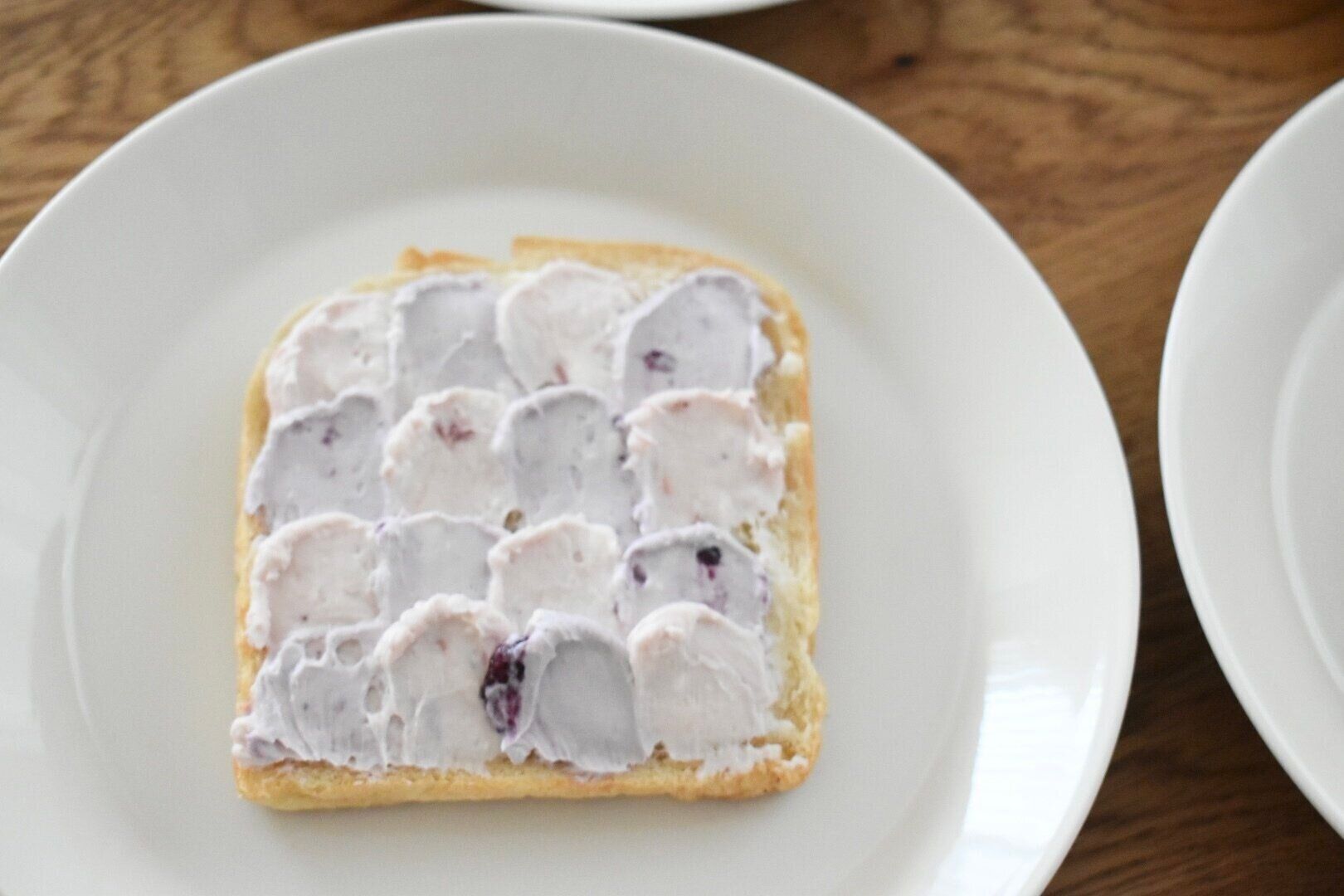 時間のあるときにおすすめしたいのが”ウェーブトースト”。スプーンの背を使って波のようにクリームを乗せていきます。クリームチーズやホイップクリームにお好みのジャムを混ぜて色味をだします。