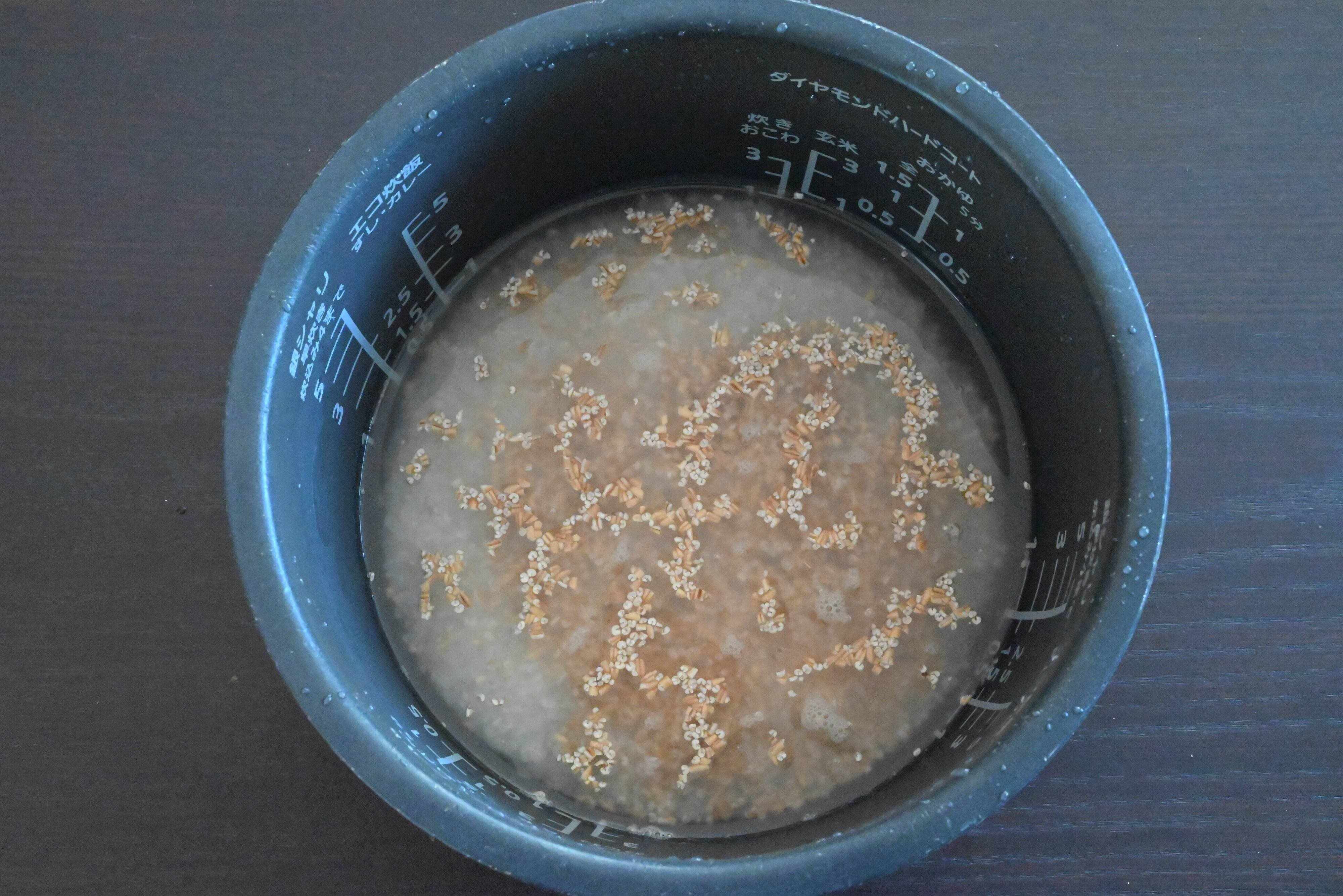 (1)米を通常どおりに研ぎ、水230mlとオートミールを加える。