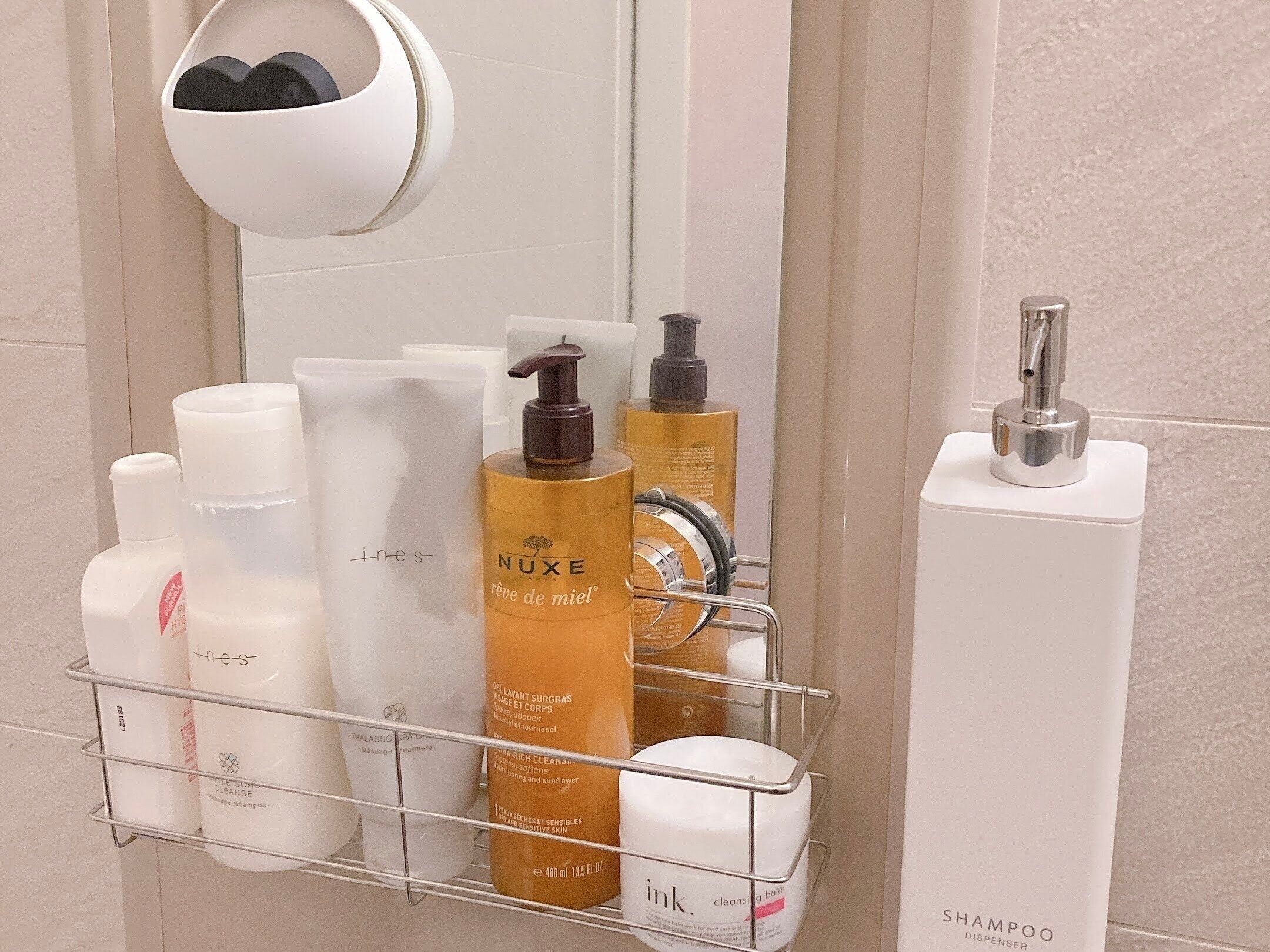 築年数がたった賃貸マンションのため、浴室の壁は磁石がくっつかないので、鏡や壁にくっつけることのできるアイテムを使って浮かせる収納をつくっています。