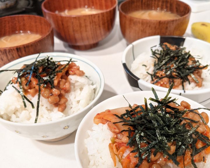 ・ご飯+納豆+しらす(orキムチ)+海苔+味噌汁