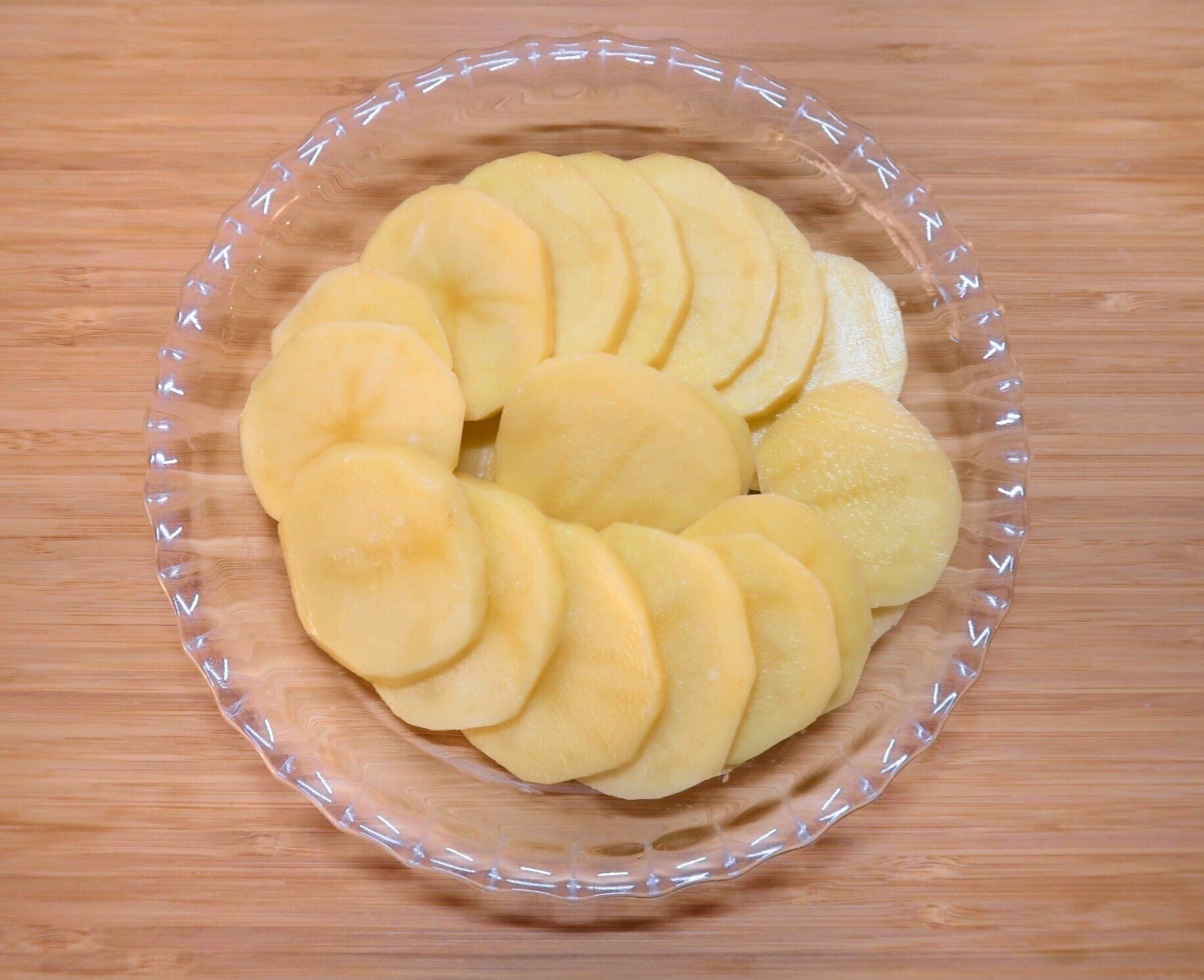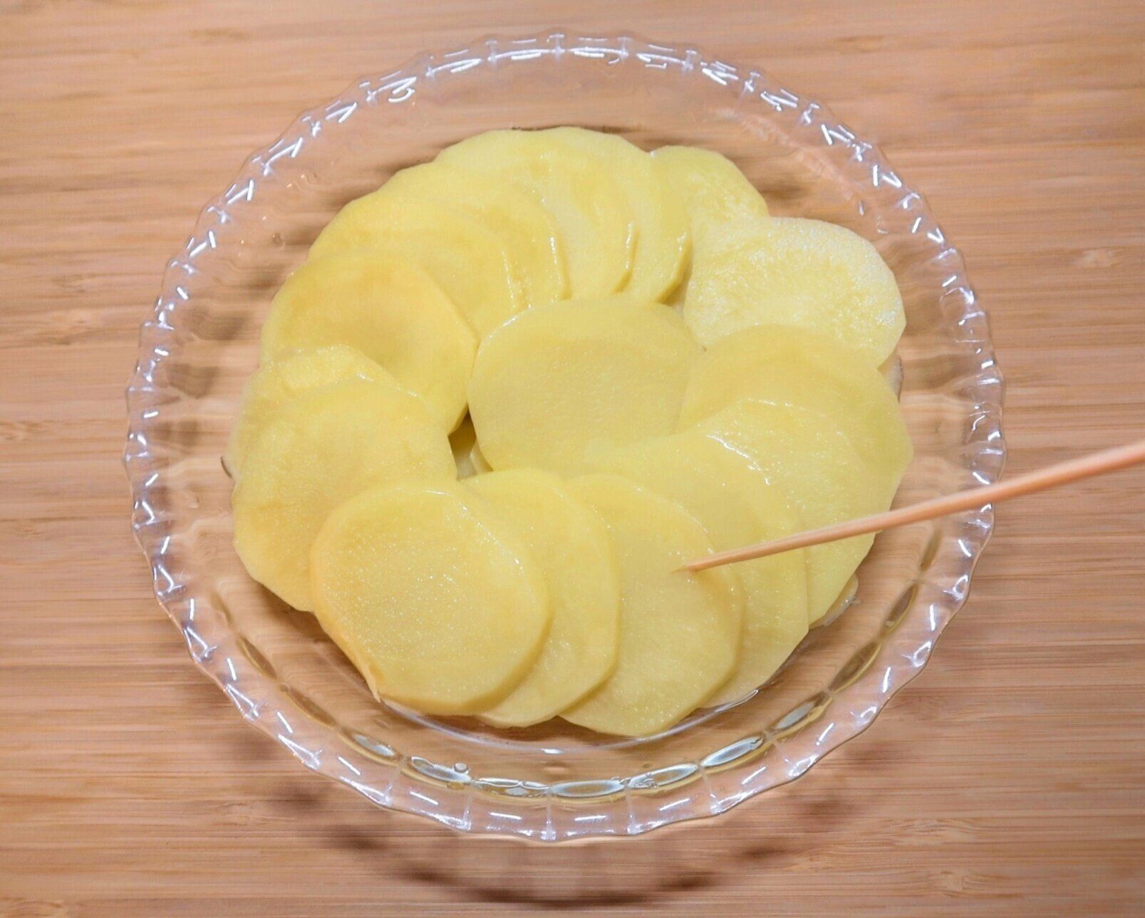 耐熱のグラタン皿にじゃがいもを並べ、ふんわりとラップをかけて600Wの電子レンジで約4分加熱します。