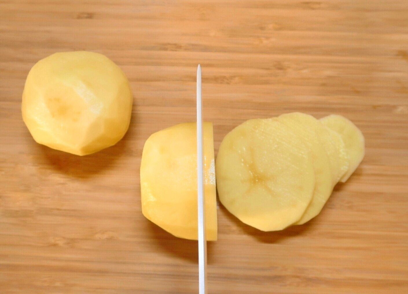 じゃがいもは皮をむいて芽を取り除き、5mm幅のうす切りにします。あえて水にさらさず、じゃがいものでんぷん質をいかしたクリーミーな口あたりに仕上げます。