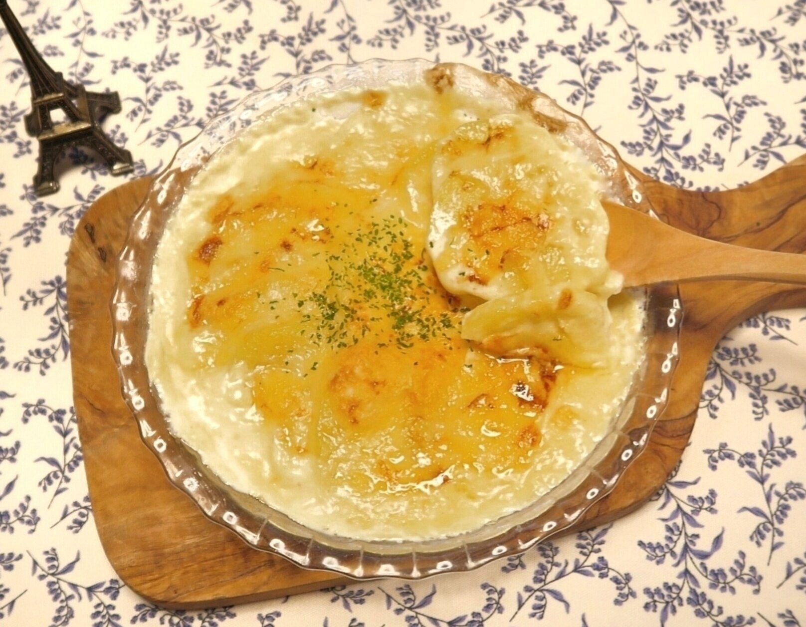 オーブントースターから取り出し、お好みでドライパセリをふりかけたら「クリーミーポテトグラタン」の完成です!生クリームを使用することでコクのある濃厚な味わいに。