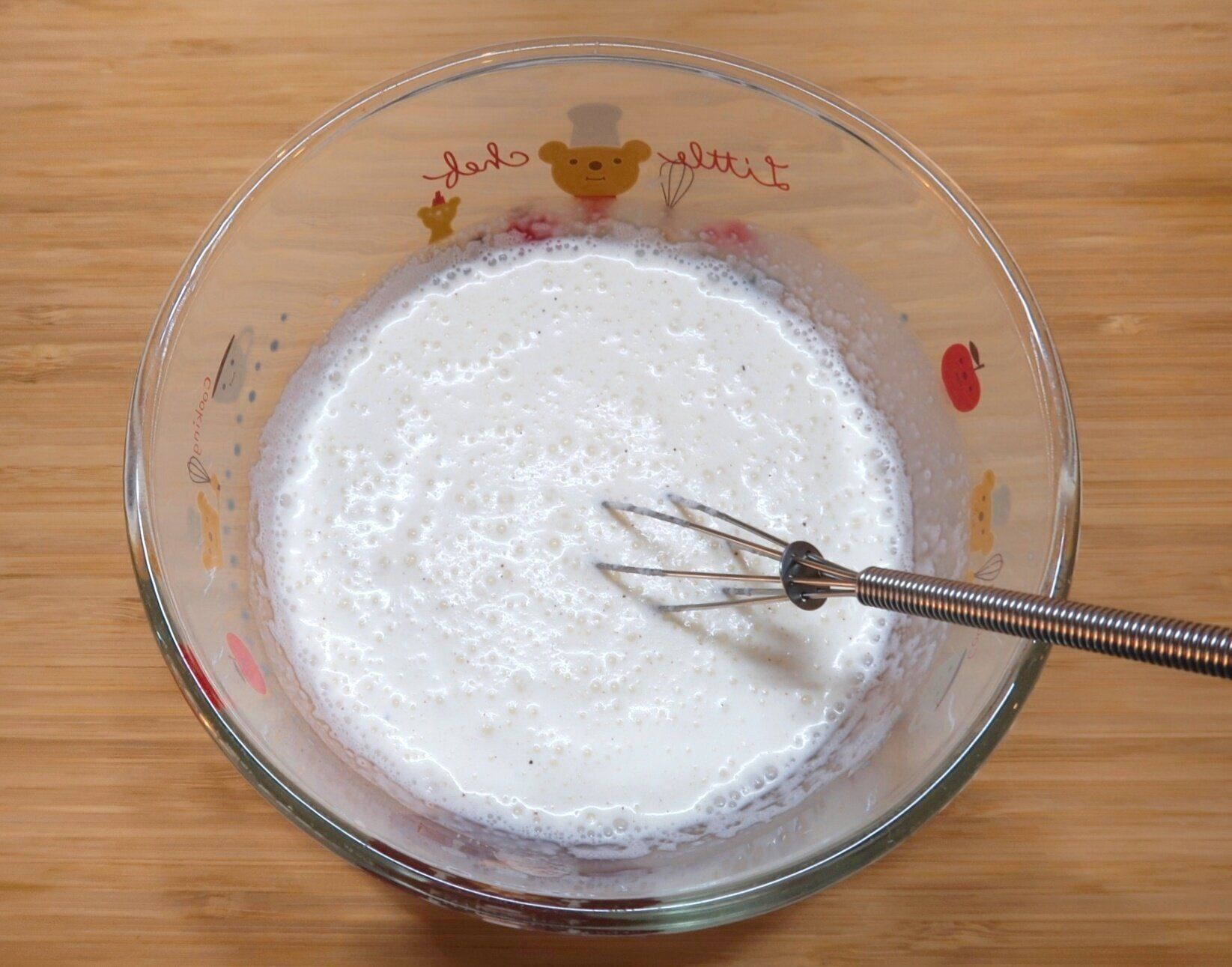 ボウルに生クリーム、マヨネーズ、ナツメグ(お好みで)を入れよく混ぜ合わせます。味見をして塩、こしょうで味を調えます。