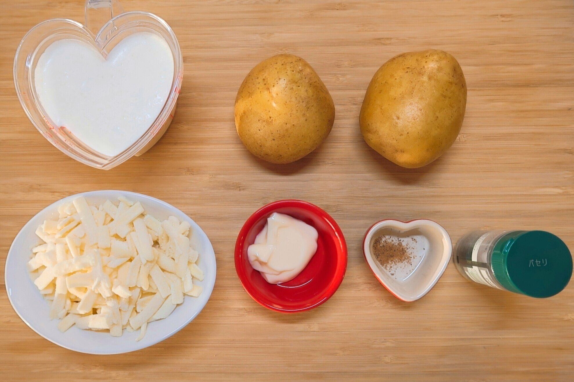 加熱したじゃがいもに(3)のソースをかけ、ピザ用チーズを全体にのせます。オーブントースターでこんがりと焼き色がつくまで焼きます。