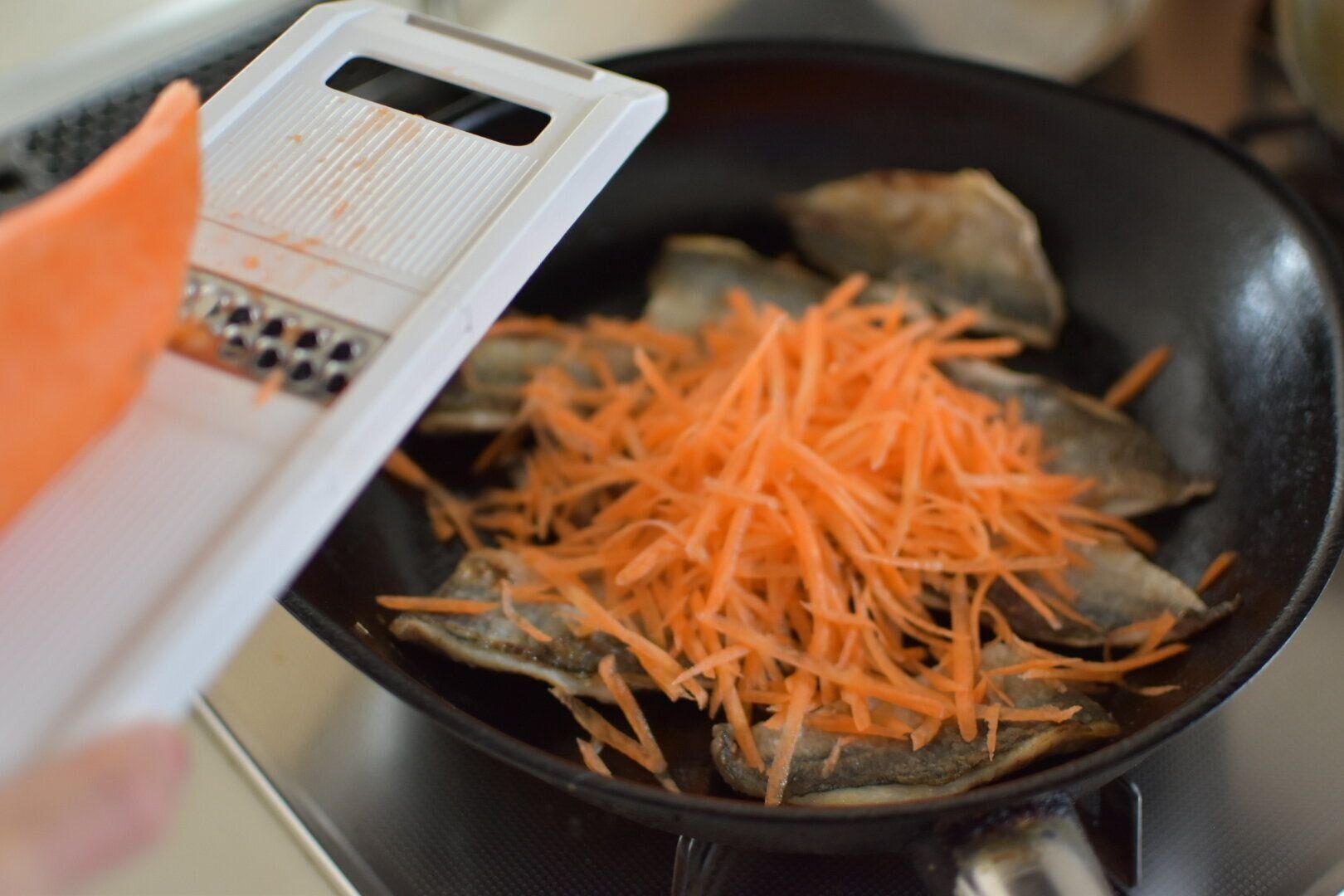 スライサーやキッチンはさみを使って、鍋やフライパンに直接すれば料理がもっと簡単に。