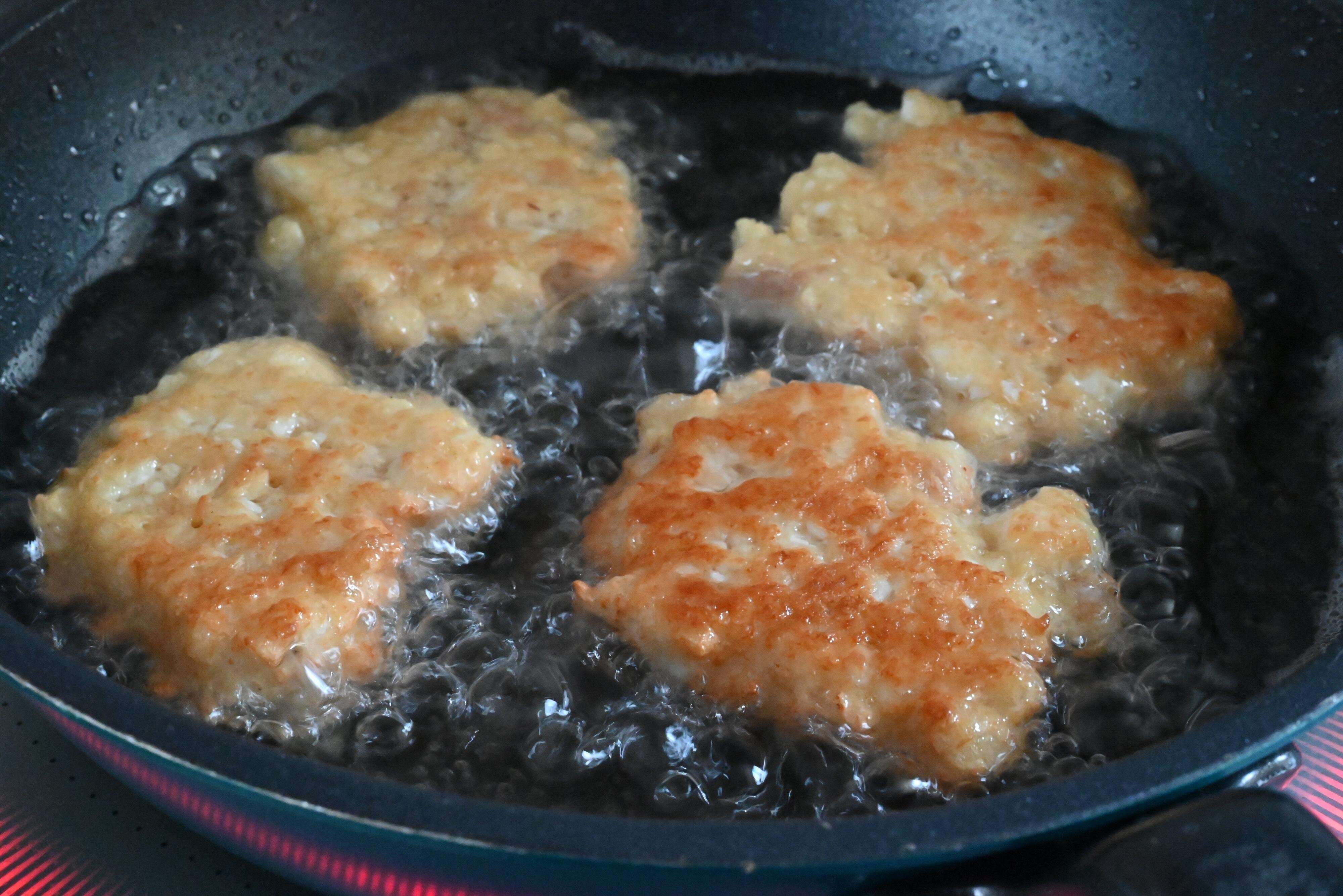 (3)フライパンに1cm程度の高さまで油を入れて加熱する。